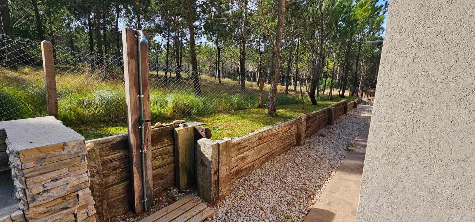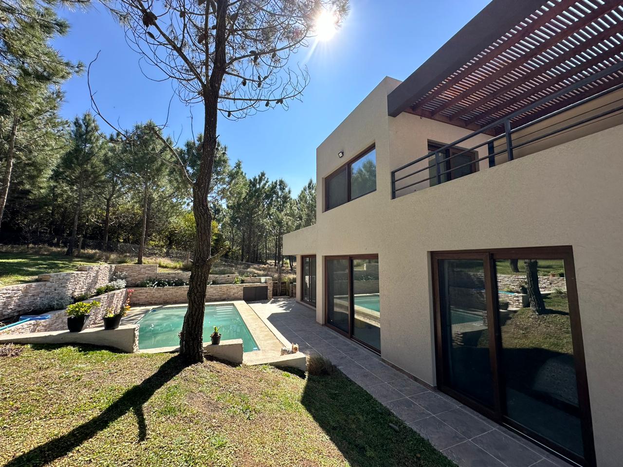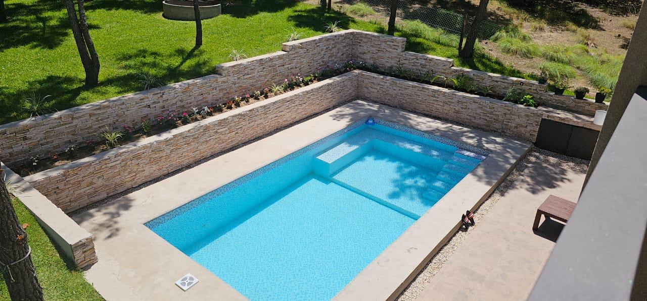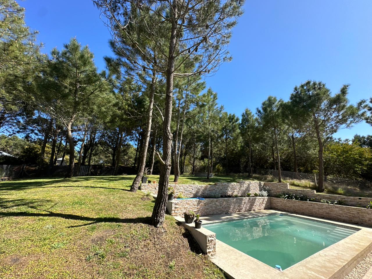 Exterior: Hermoso parque arbolado, parquizado con césped en panes, piscina de 4 x 7,50 con venecitas e iluminación con control remoto, fogonero. Riegos por aspersión. Cochera semicubierta. Perímetro del lote cercado.