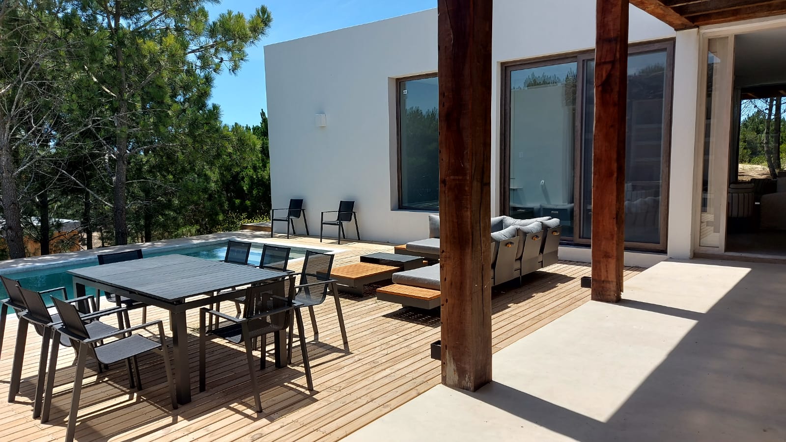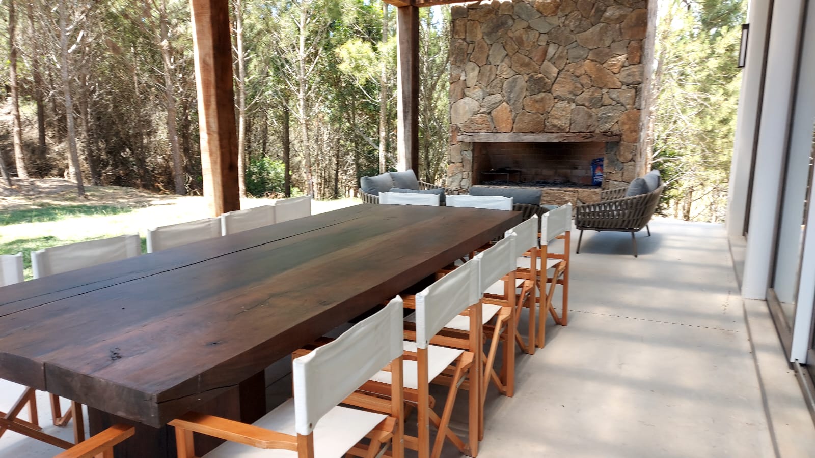 La galería da al jardín, con chimenea/parrilla, set de sillones y mesa de madera para 16 personas.