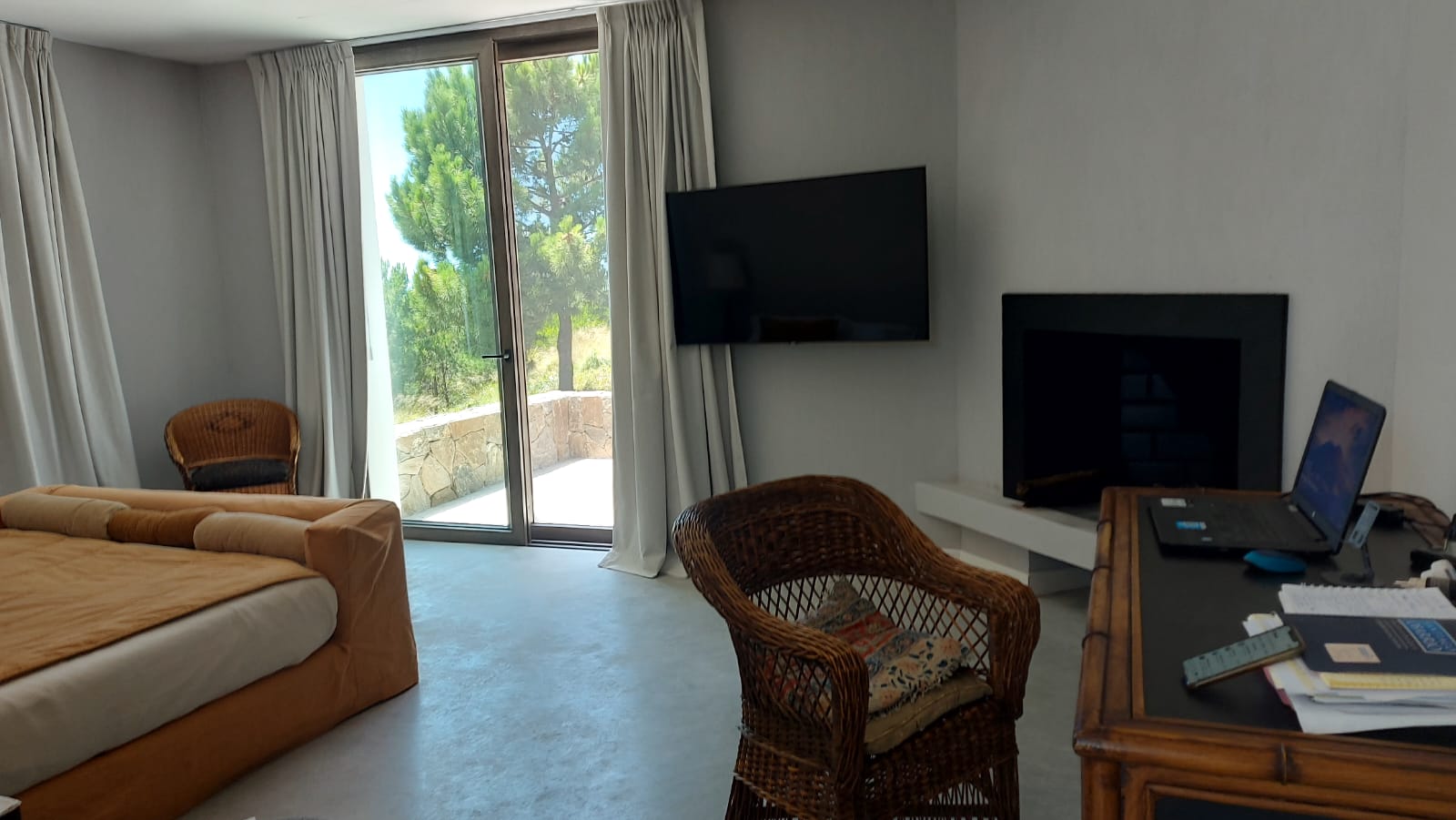 Dormitorio frente al mar, con chimenea, TV, vestidor, baño, y terraza que da al jardín.