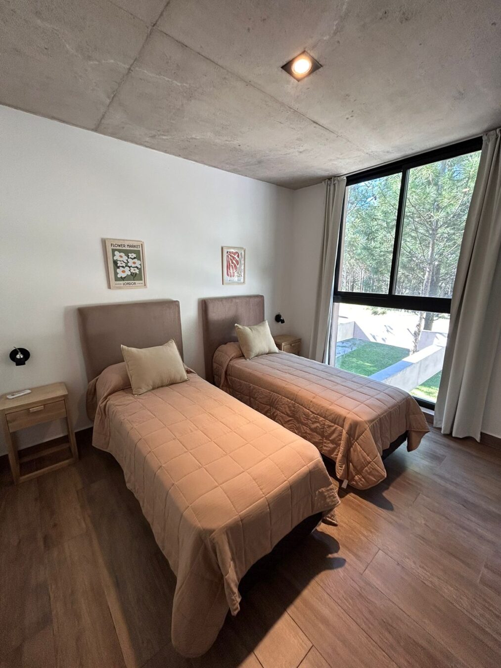 – Dos habitaciones: Una con cama matrimonial y terraza privada, la otra habitación con dos sommiers individuales.