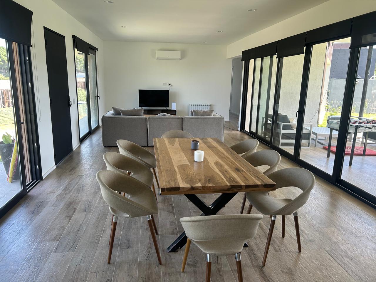 Galería con mesa de aluminio y sillas para 8 personas.