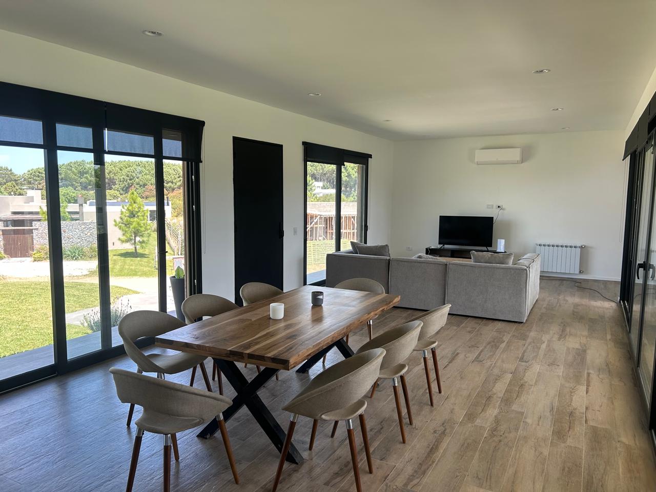 En el comedor, una mesa para 8 personas con platos, bols, tazas y cubiertos.