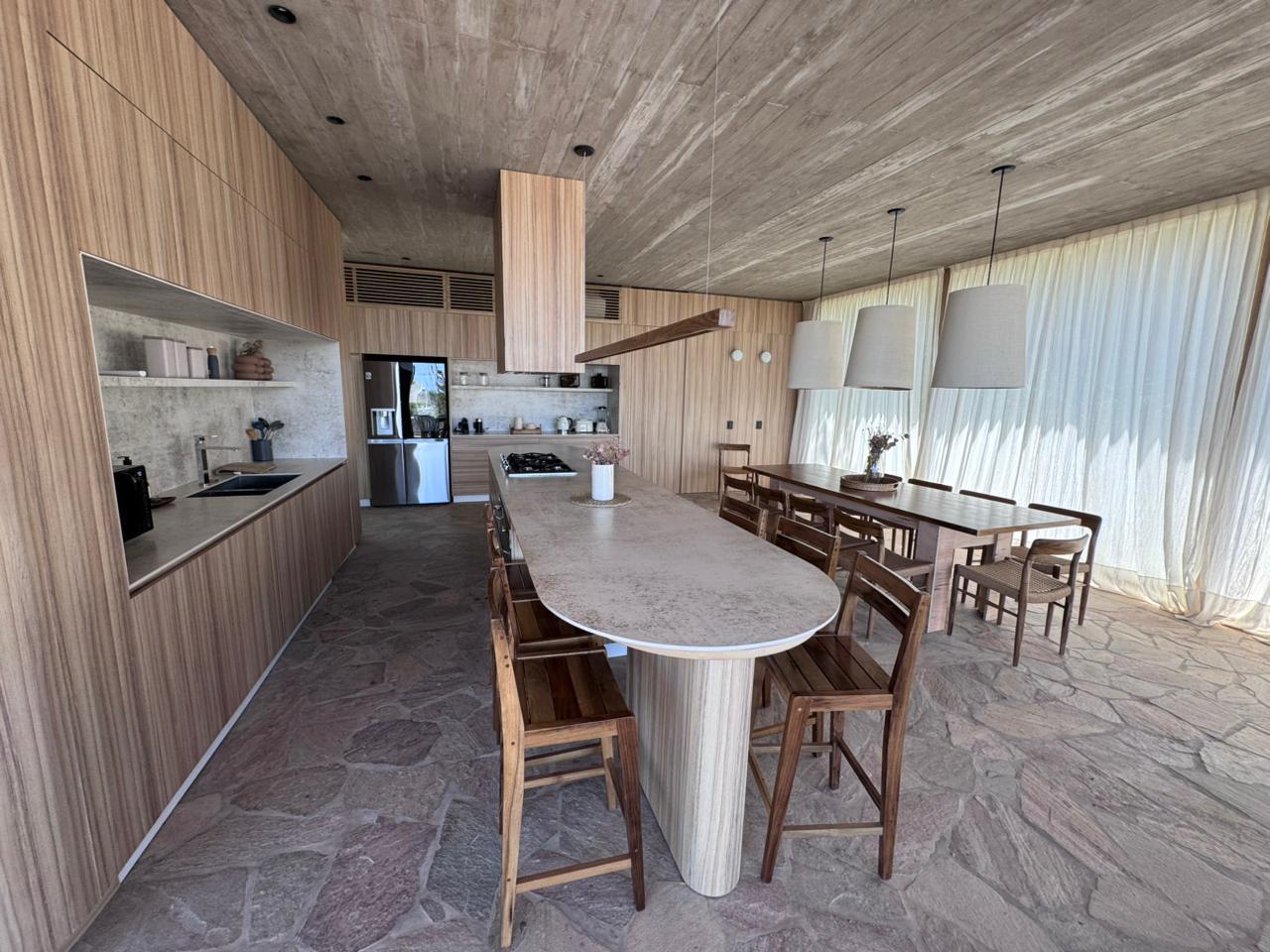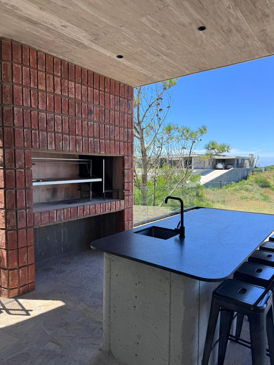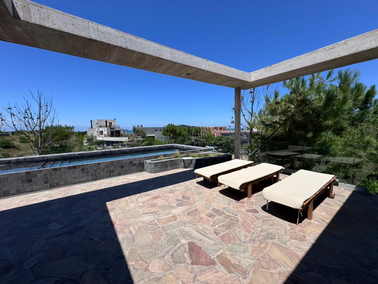 En el piso superior, se encuentra el living, un toilette, el comedor con cocina integrada y terraza semi cubierta con parrilla y pileta con vista al mar.