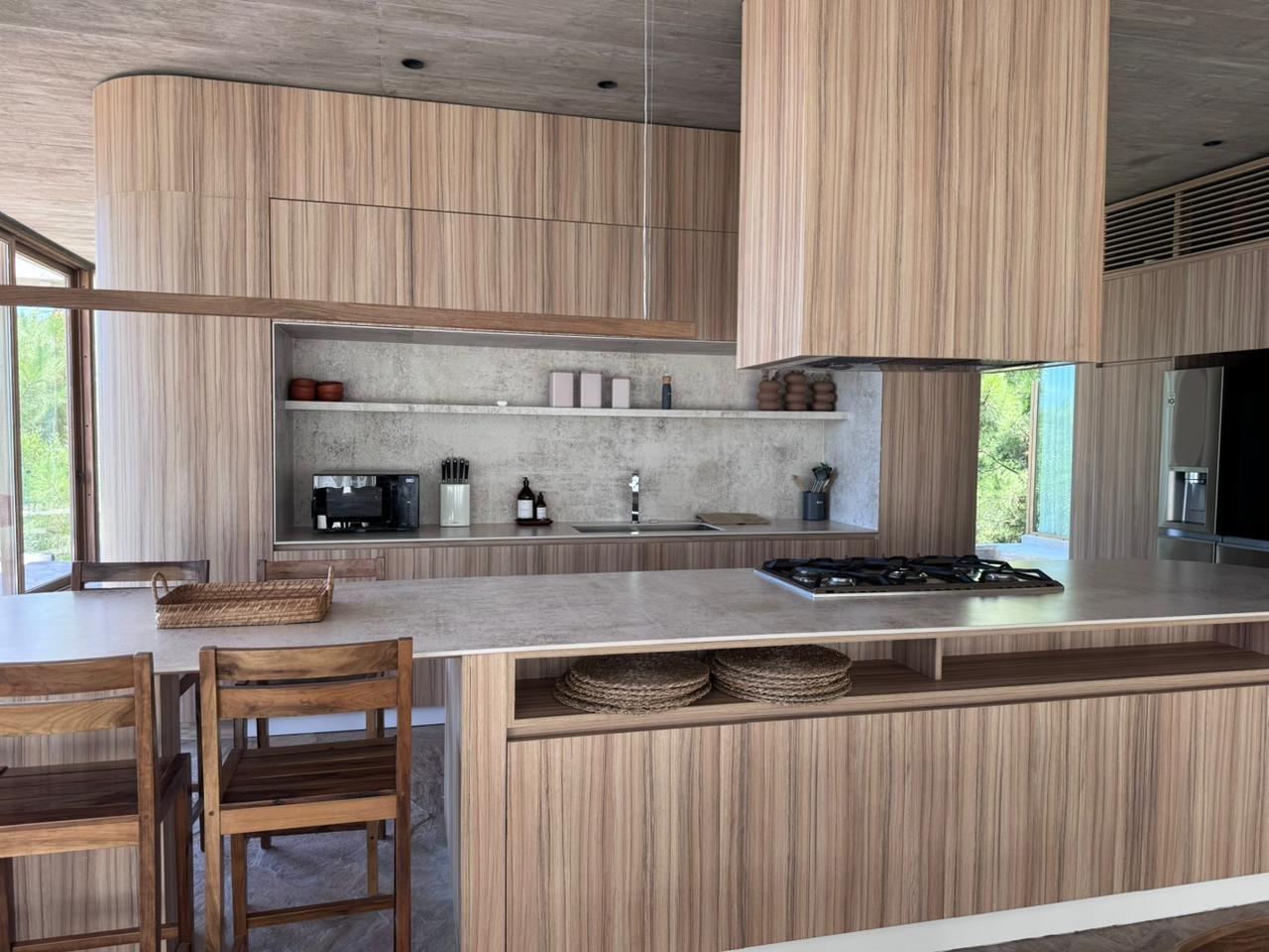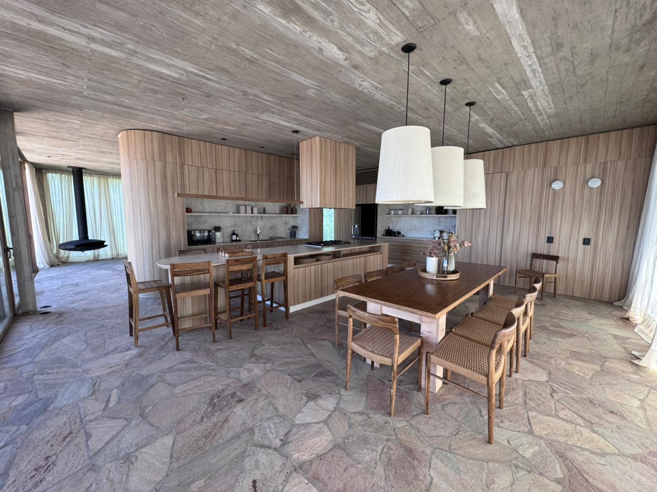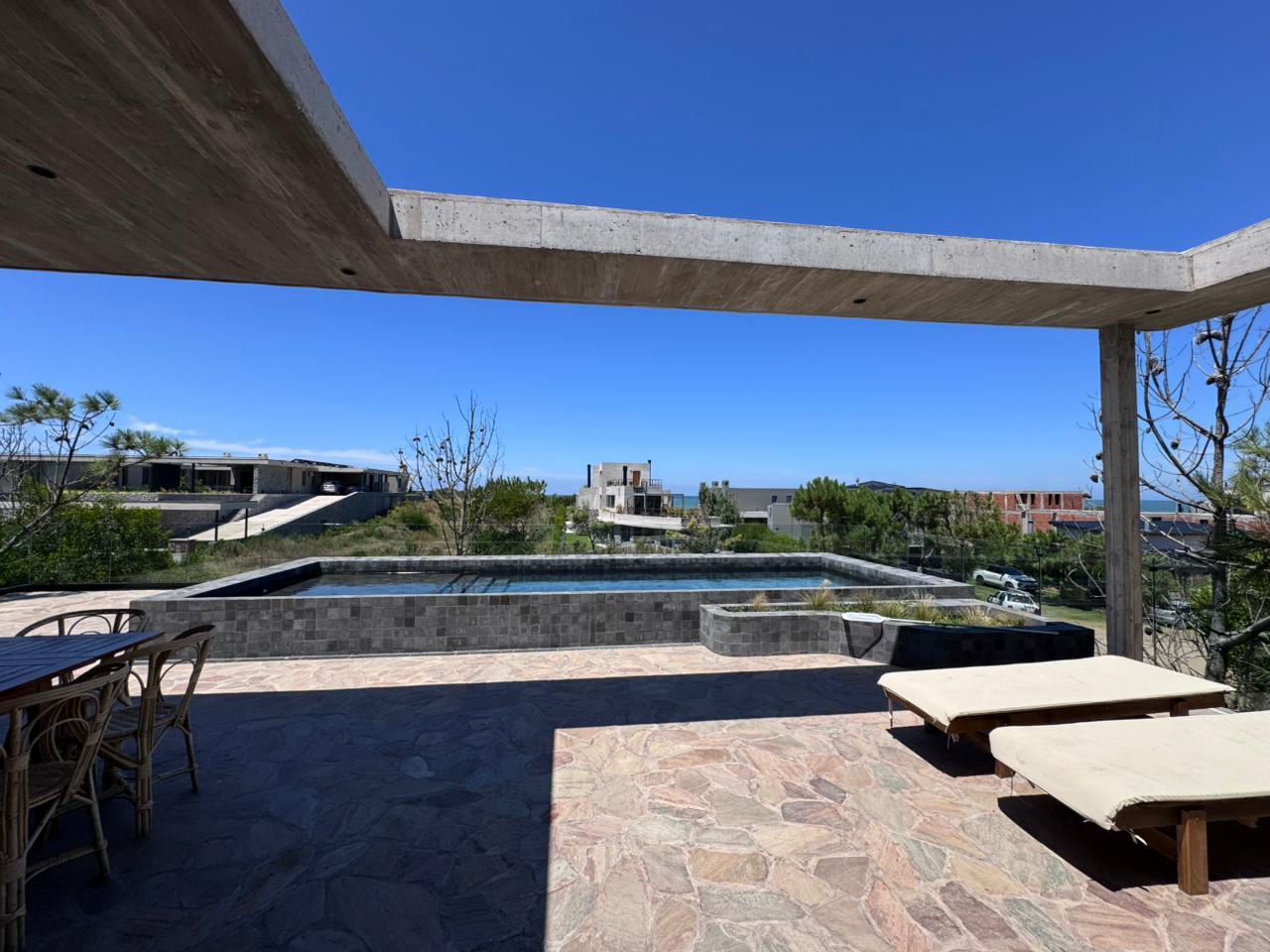 En el piso superior, se encuentra el living, un toilette, el comedor con cocina integrada y terraza semi cubierta con parrilla y pileta con vista al mar.