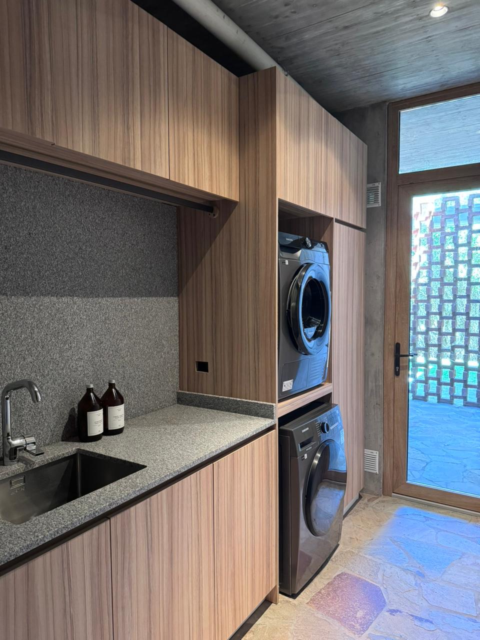 El piso inferior posee lavadero independiente, cochera, toilette, un dormitorio en suite, galería cubierta con cocina propia y salida al jardín.