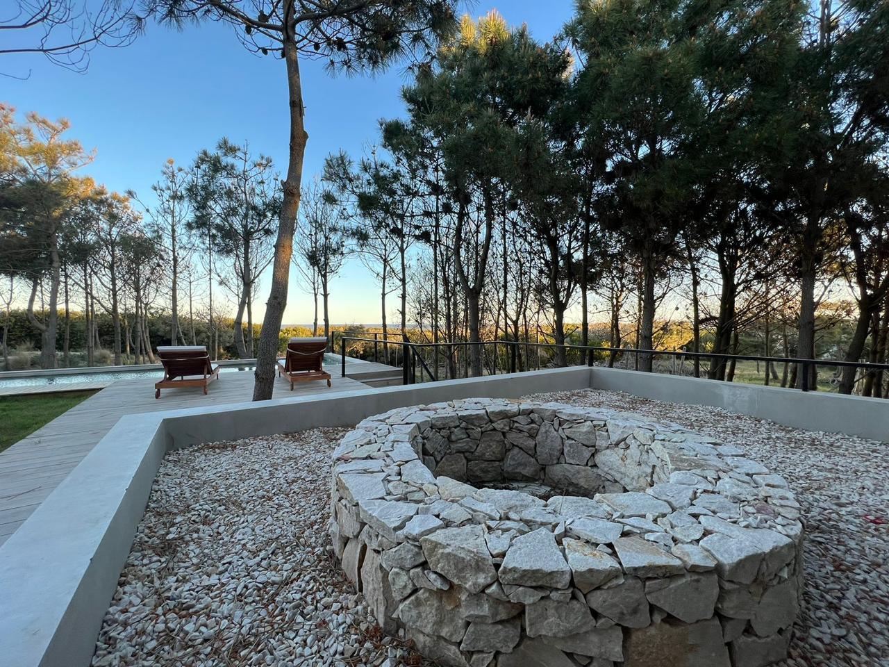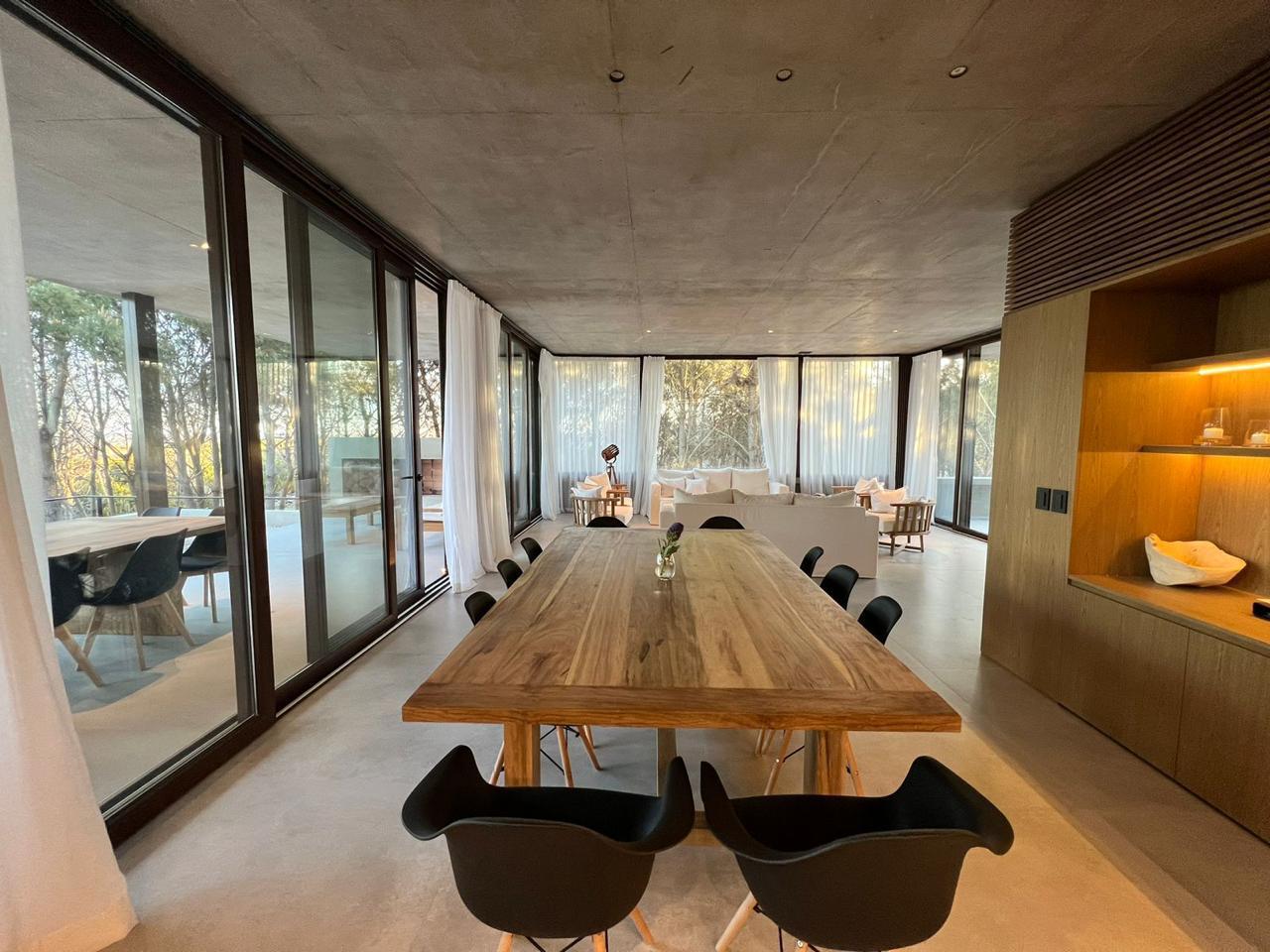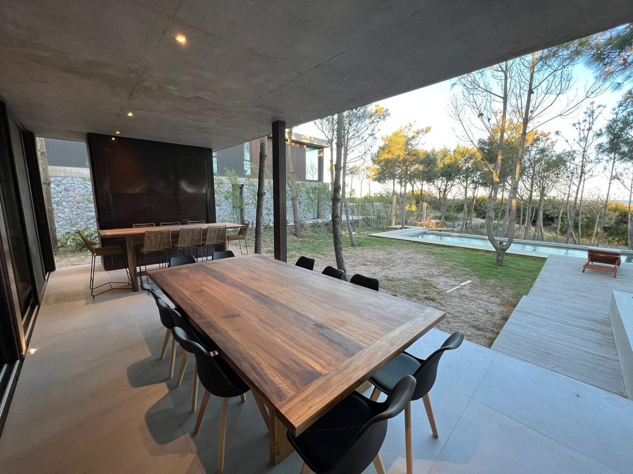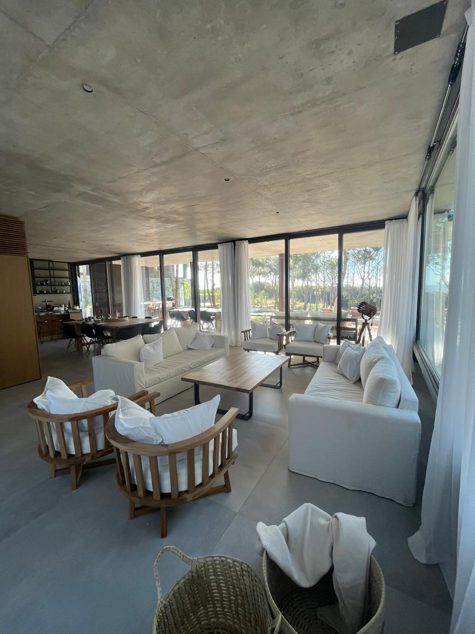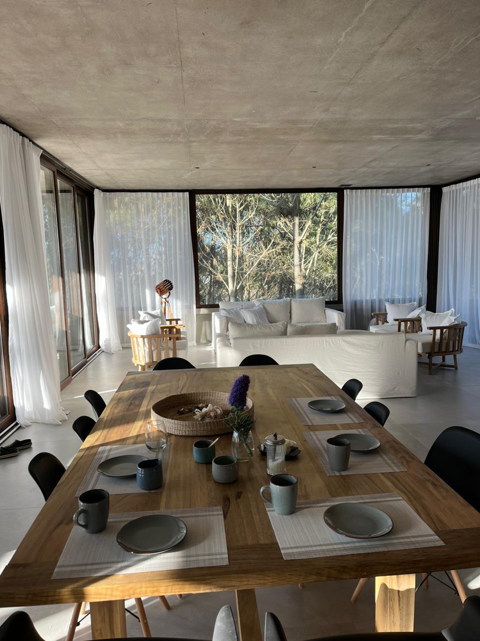 – Amplias galerías semicubiertas de verano hacia el mar con parrilla y living de fuego, equipada con Barra y banquetas, amplia mesa de madera maciza para 14/16 comensales y sillones que rodean el living de fuego. Galería de invierno hacia el bosque