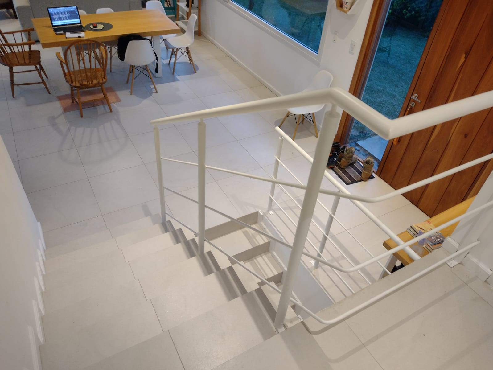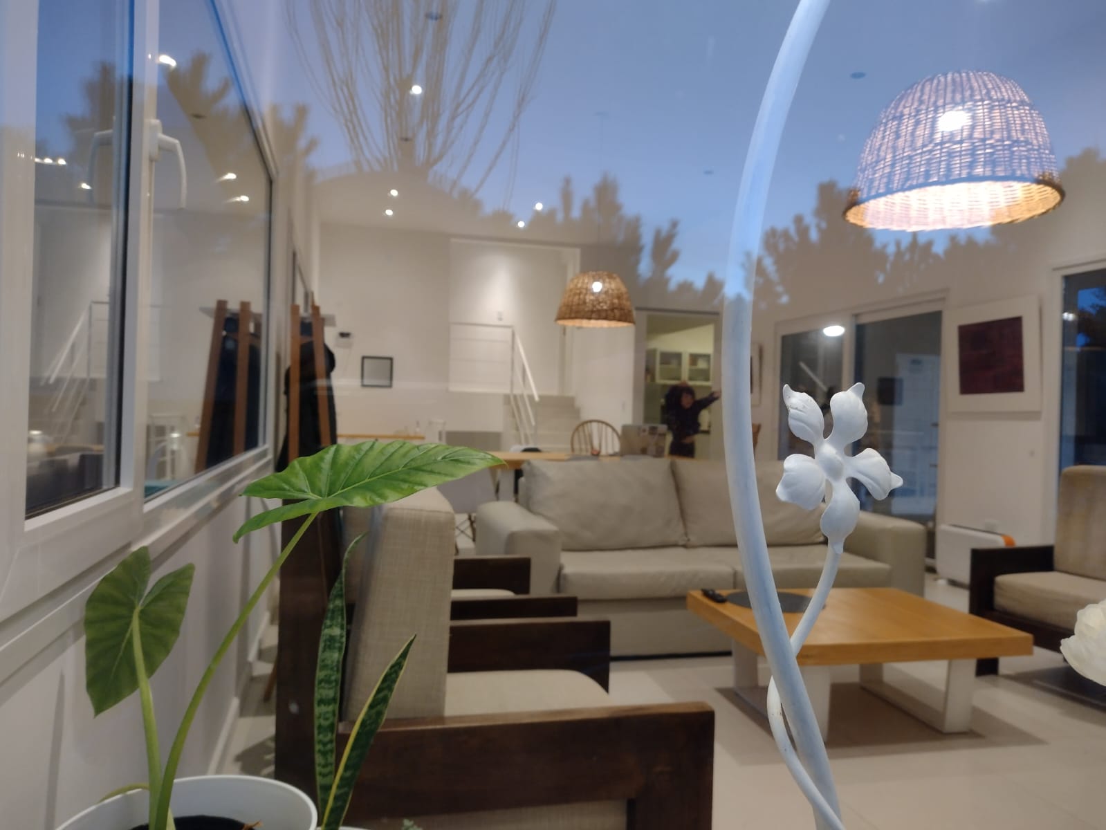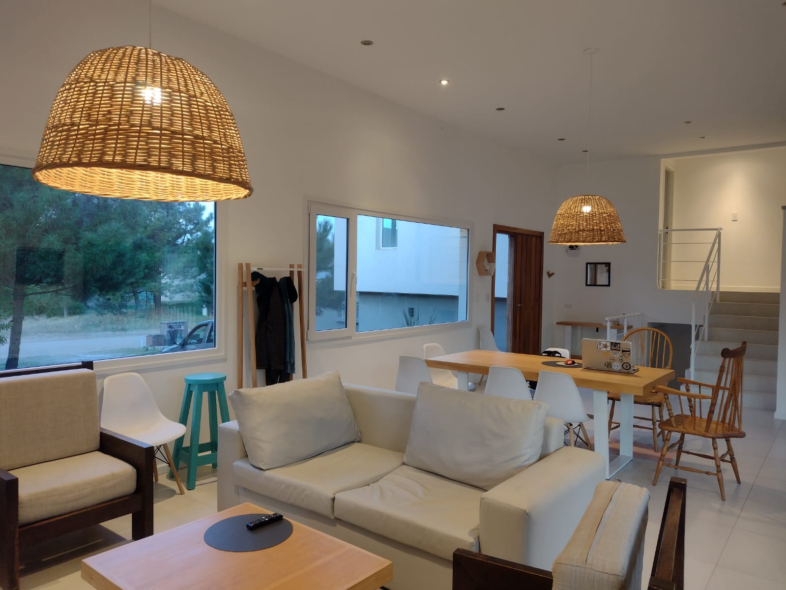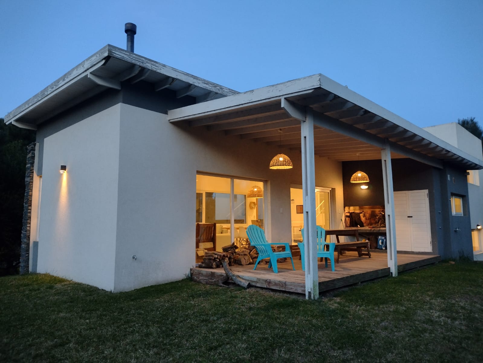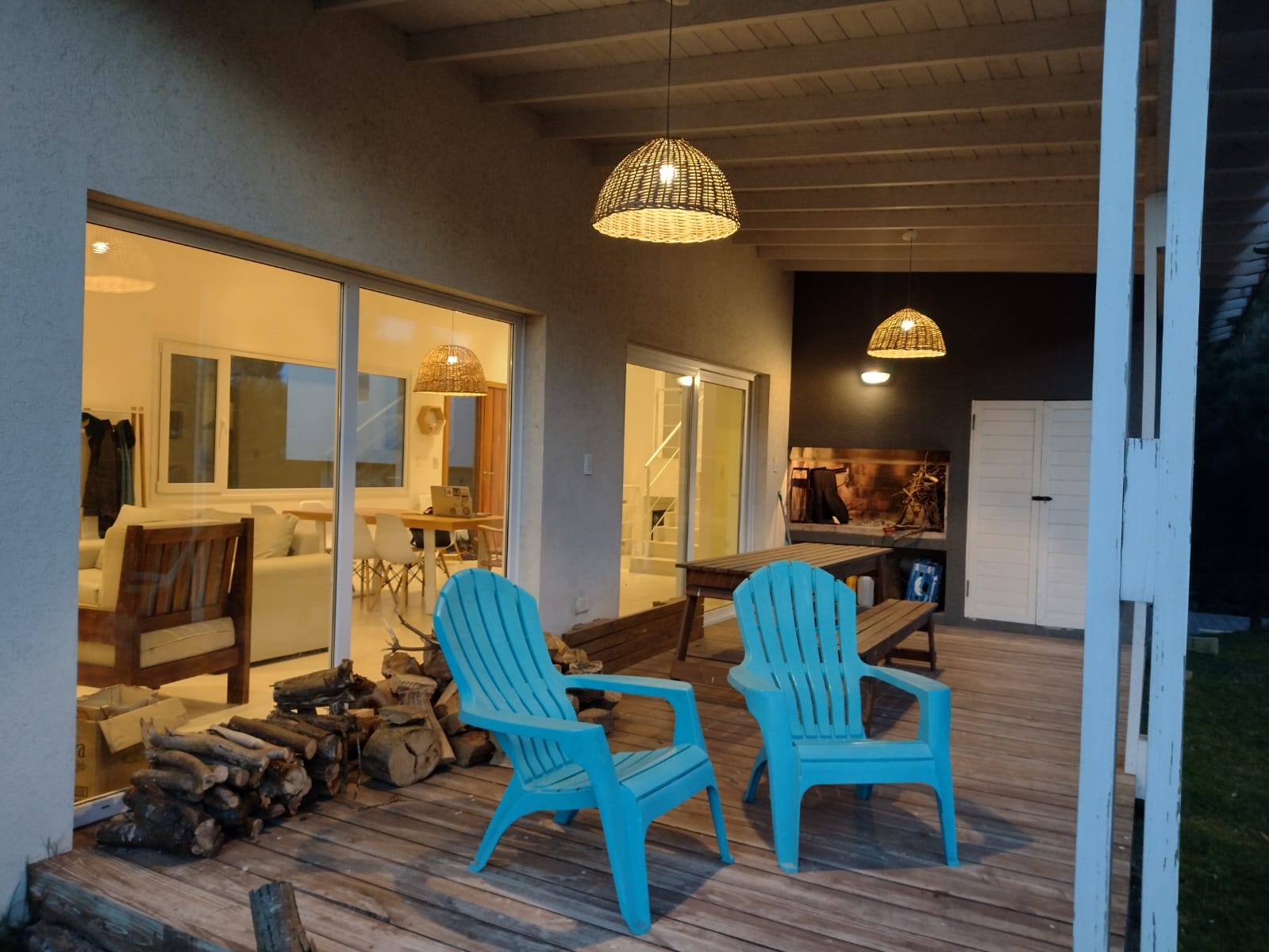 Galería exterior con amplio deck y parrilla mesa exterior y sillones de estar.
