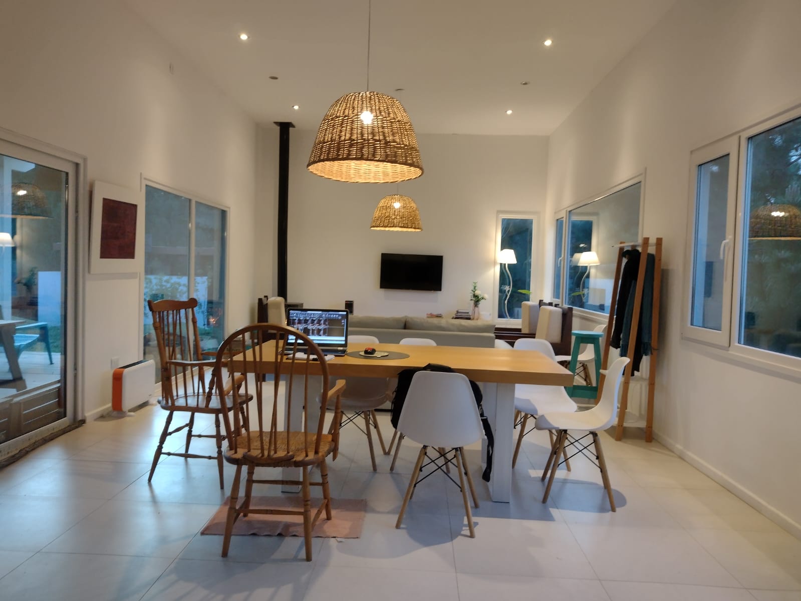 Cocina con barra desayunadora integrada al living comedor con salamandra a leña.