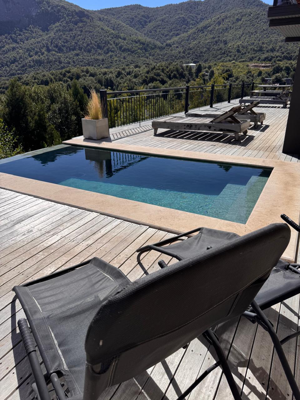 al amplio deck de impresionantes vista, equipado y con pileta (solo para verano dado qué no es climatizada) .