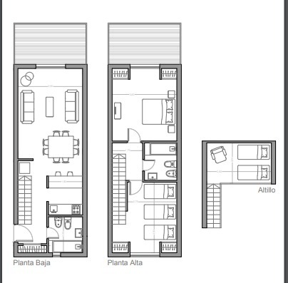 Una habitación principal con cama matrimonial. Una segunda habitación con 3 camas individuales y un altillo con 2 camas individuales. Living comedor que hace de tercer dormitorio con 2 sillones cama.