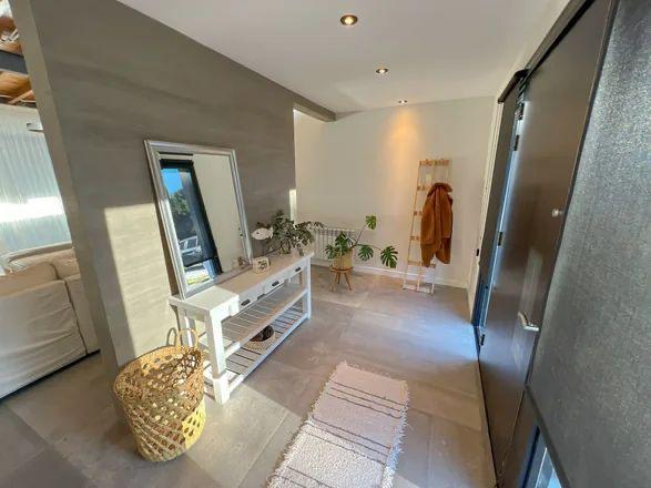 Gran galería techada de 55m2 con mesa, sillas, metegol y sillones.
