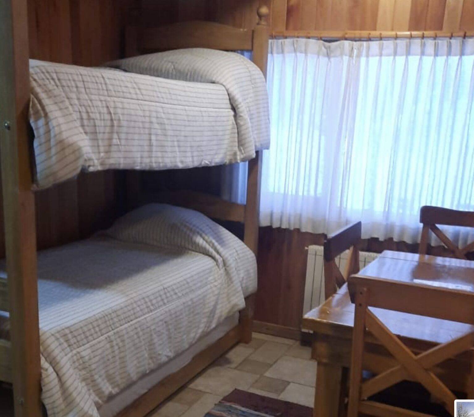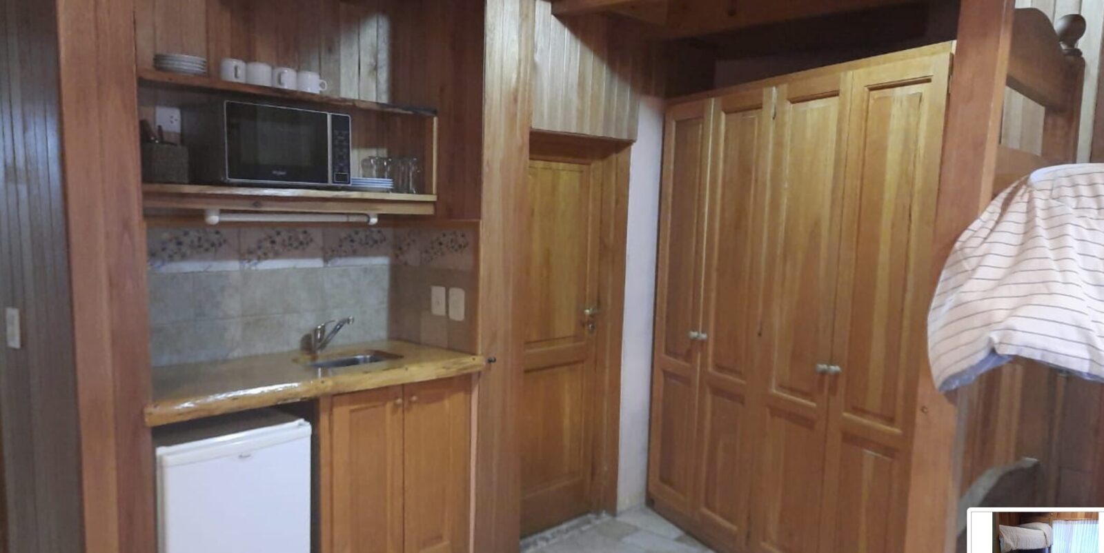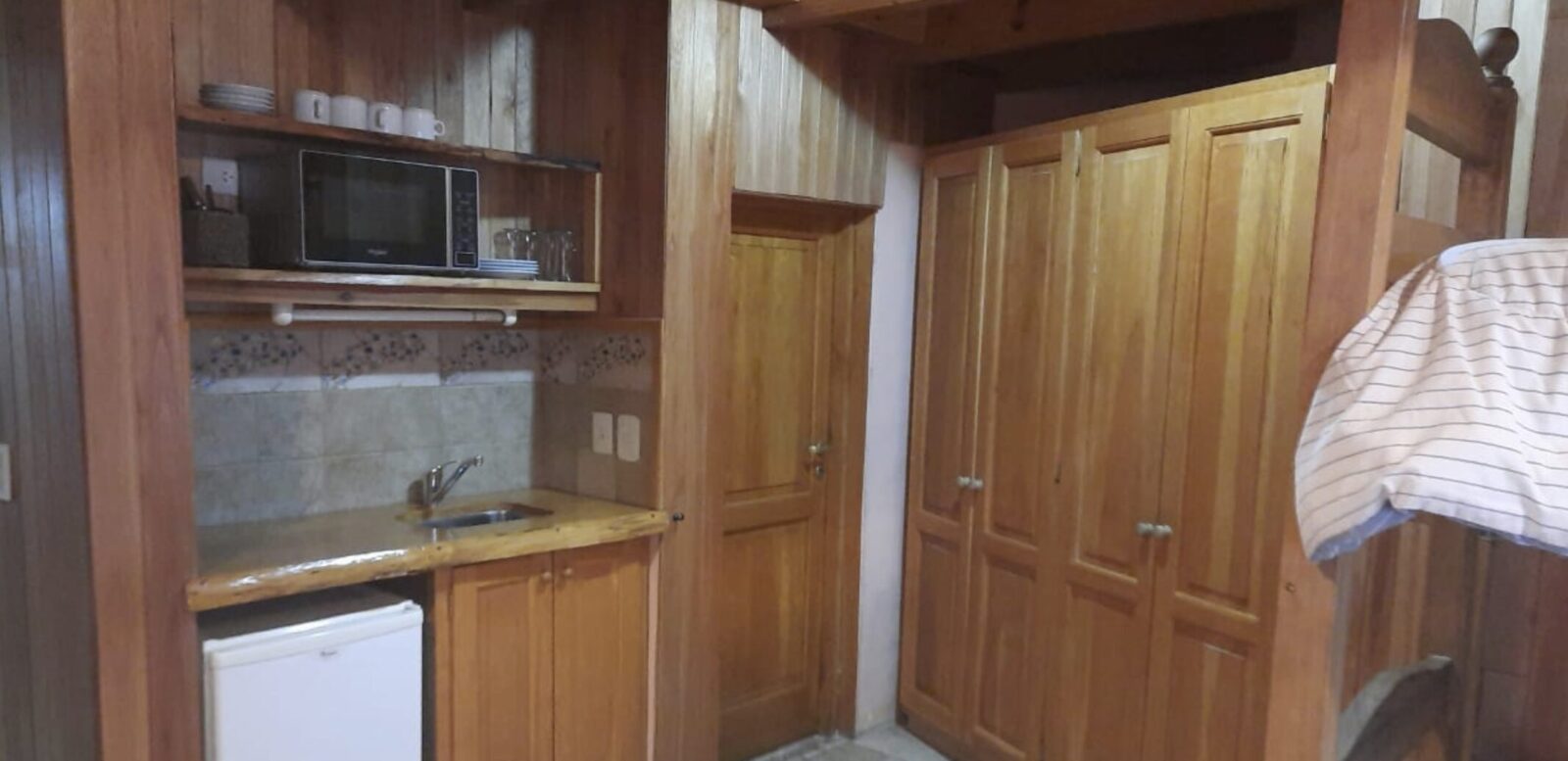 Otros dos dormis están ubicados también dentro del edificio principal donde funciona el club house y hay distintos livings con Directv y hogar a leña. Tiene dormitorio matrimonial baño completo y segundo ambiente con 2 camas y una kitchinette que tiene microondas frigobar y pava eléctrica únicamente. Cuenta con vista al volcán Lanin y al Lago Lacar