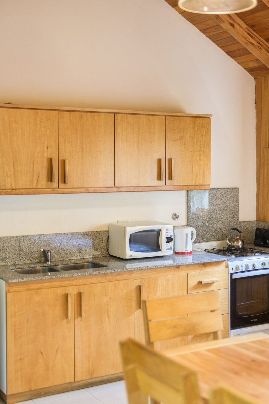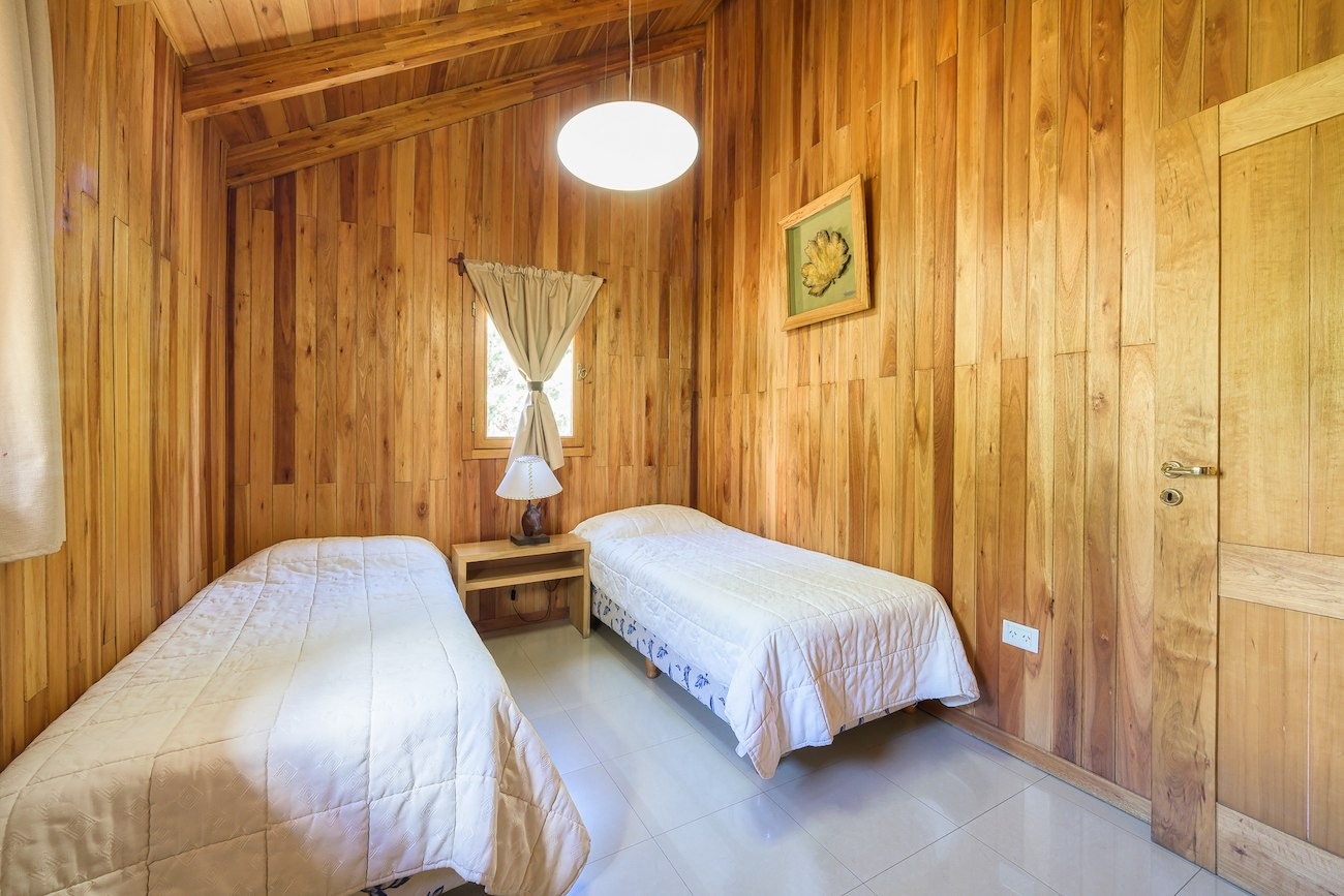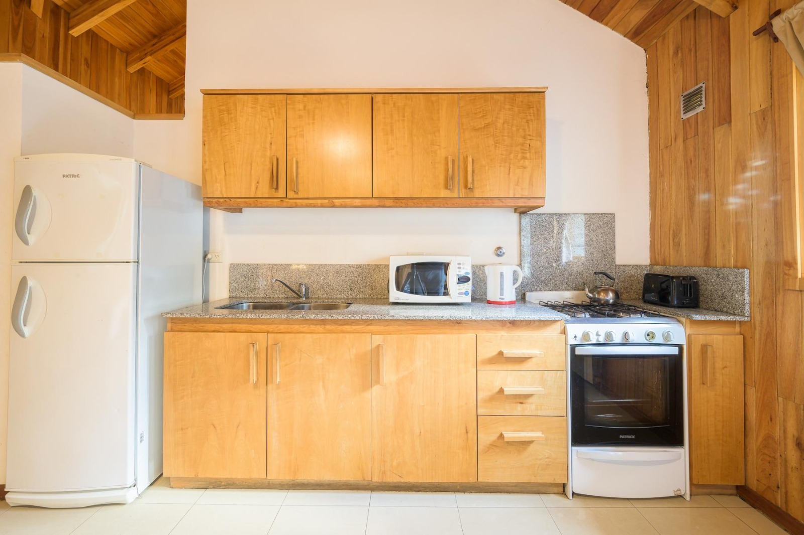 Ø Living comedor con dos camas singles. Cocina completa, cocina 4 hornallas, heladera con freezer, microondas, tostadora, pava eléctrica.