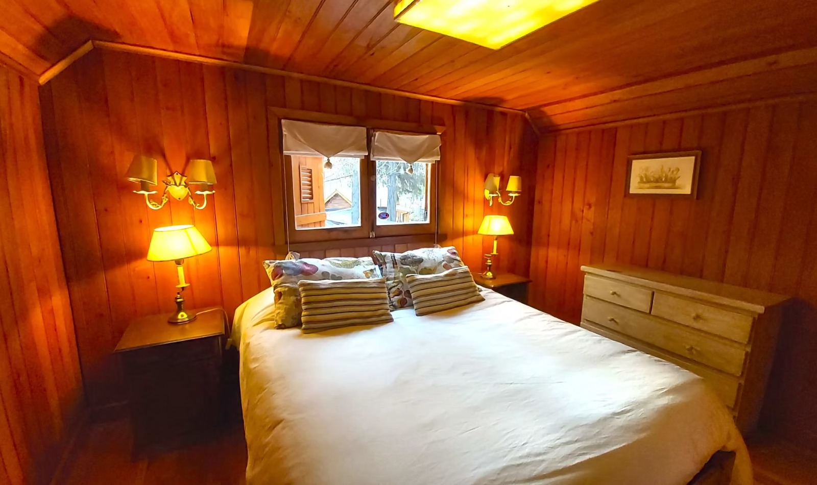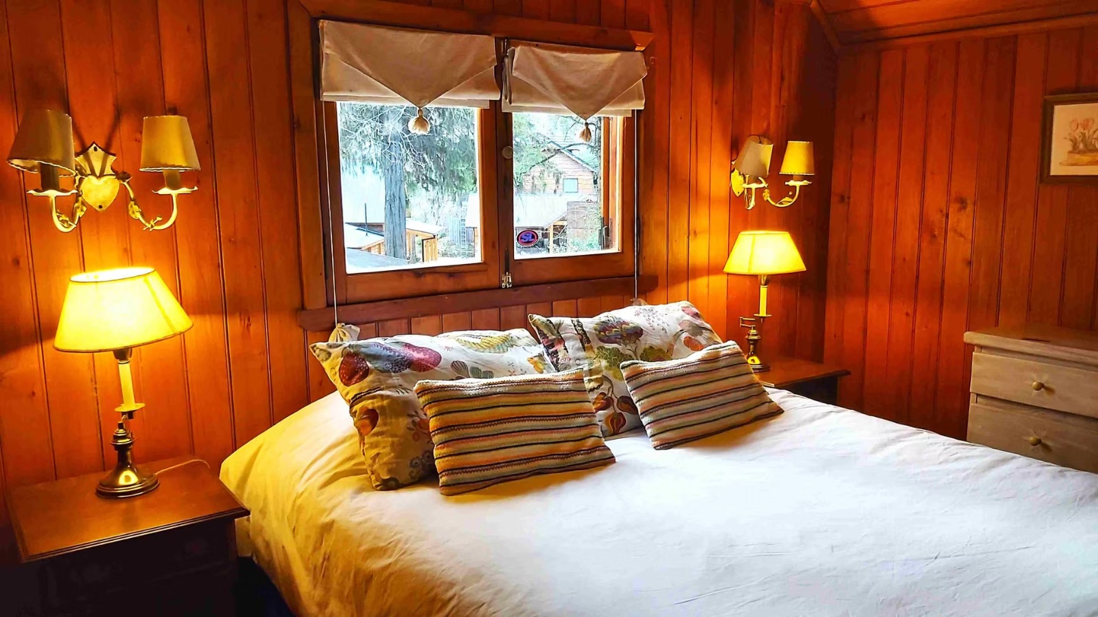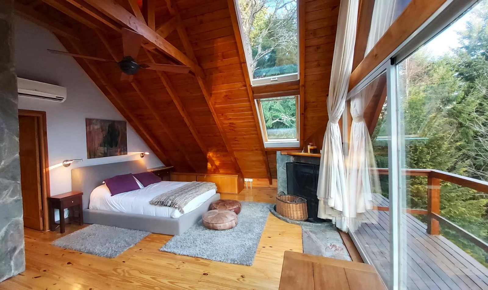 Ø Cabaña con habitación matrimonial, espaciosa, con amplios ventanales, escritorio y hogar a leña, baño en suite con hidromasaje y vestidor. Aire acondicionado.