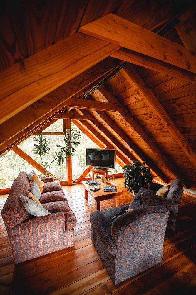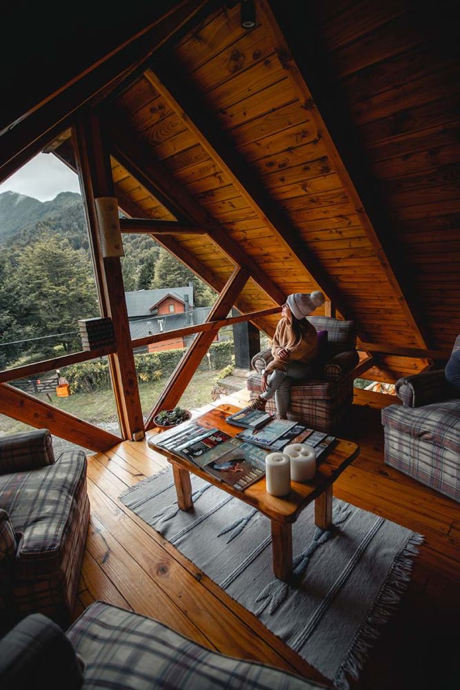 Espacio de lectura y juegos de mesa con vista a las montañas y al Lago Correntoso.