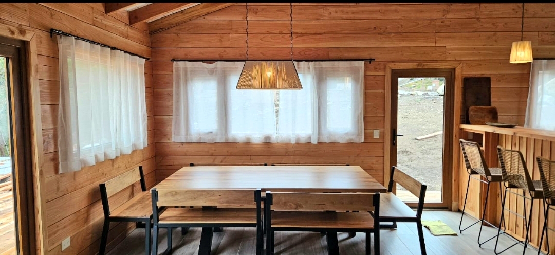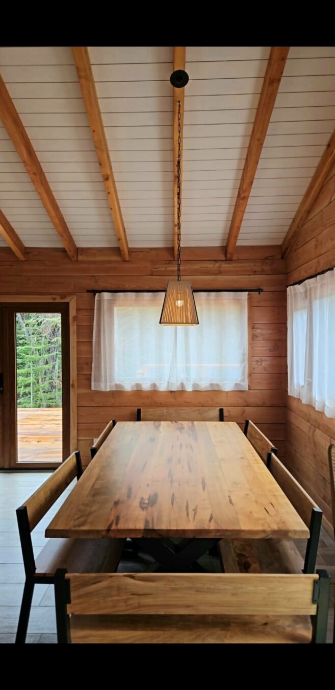 El comedor tiene mesa y bancos de madera y hierro a estrenar con capacidad para 10 personas