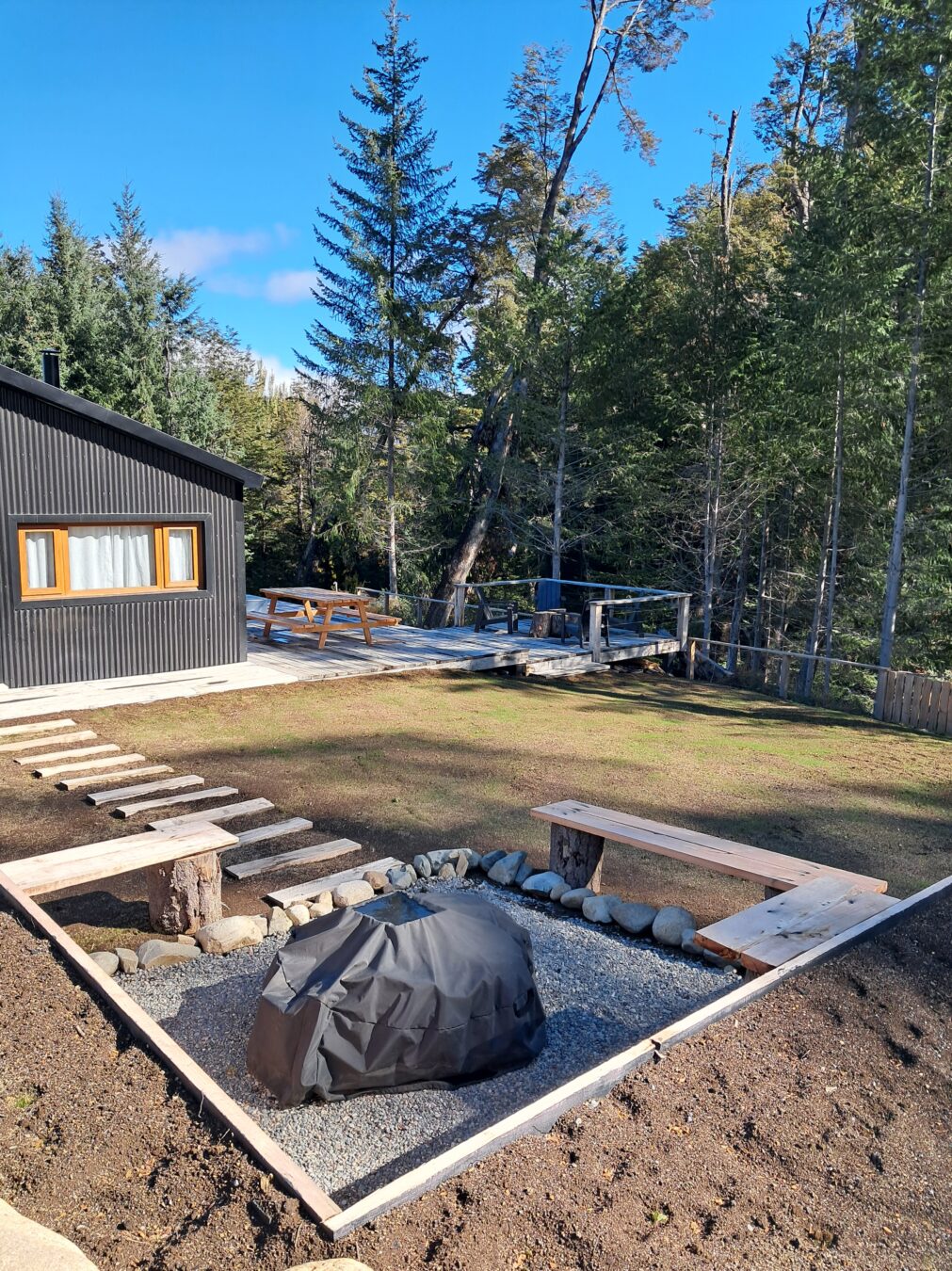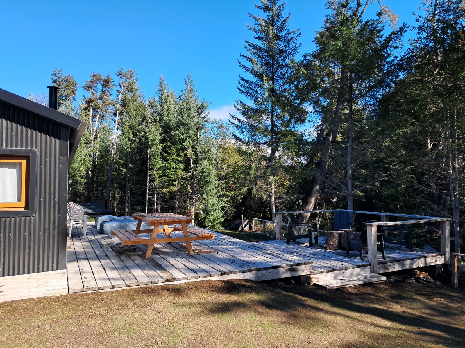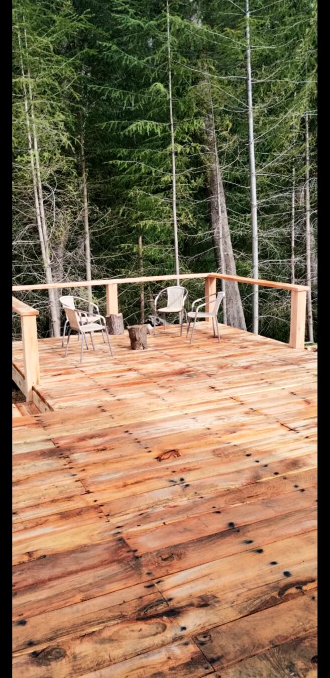 Deck de madera de coihue de 70 mts cuadrados con barandas en jardín trasero