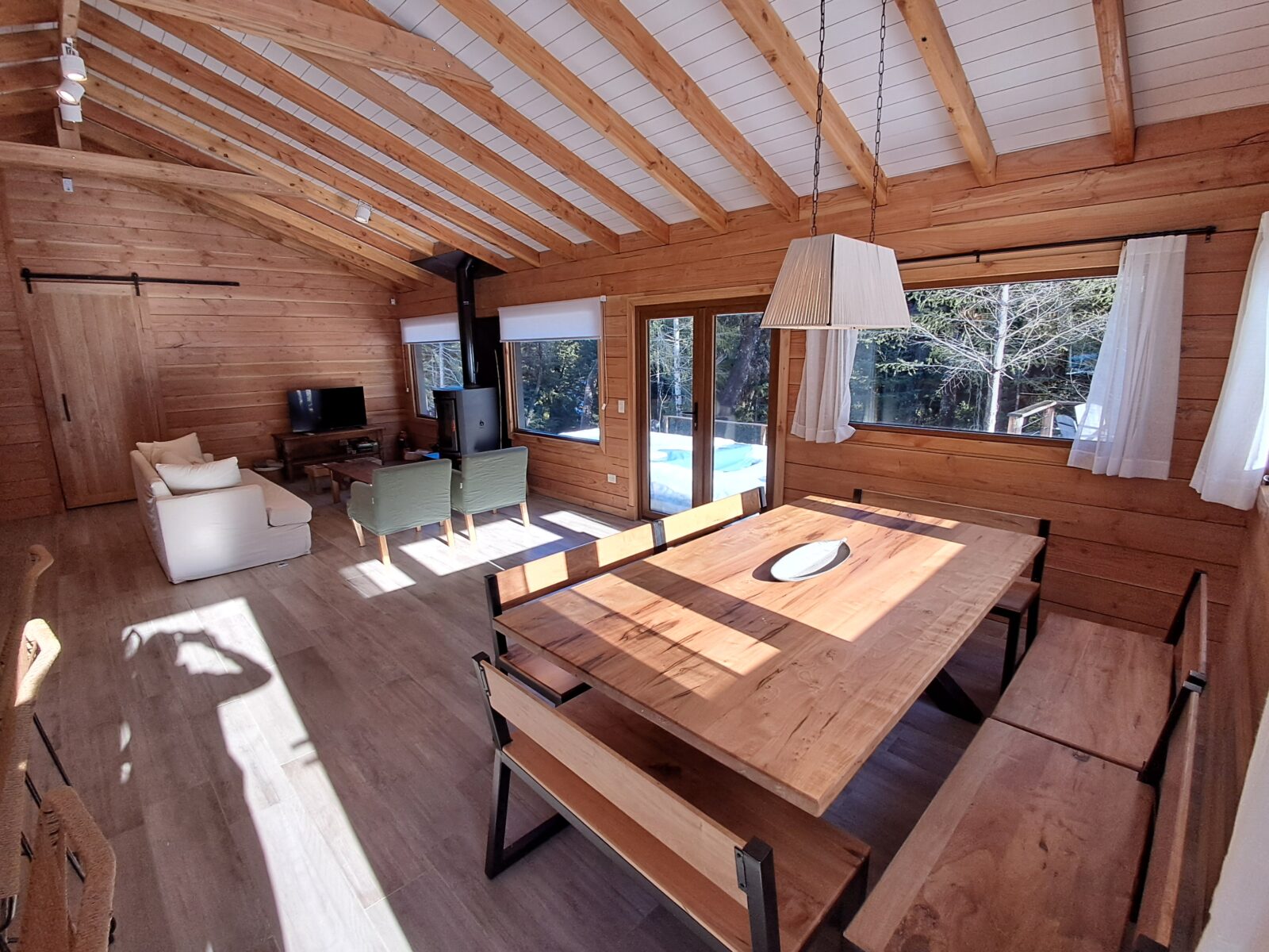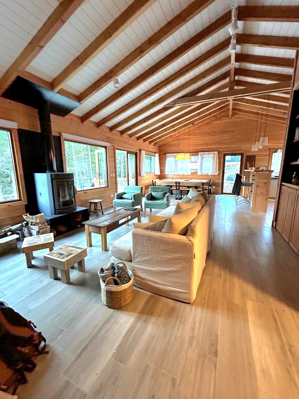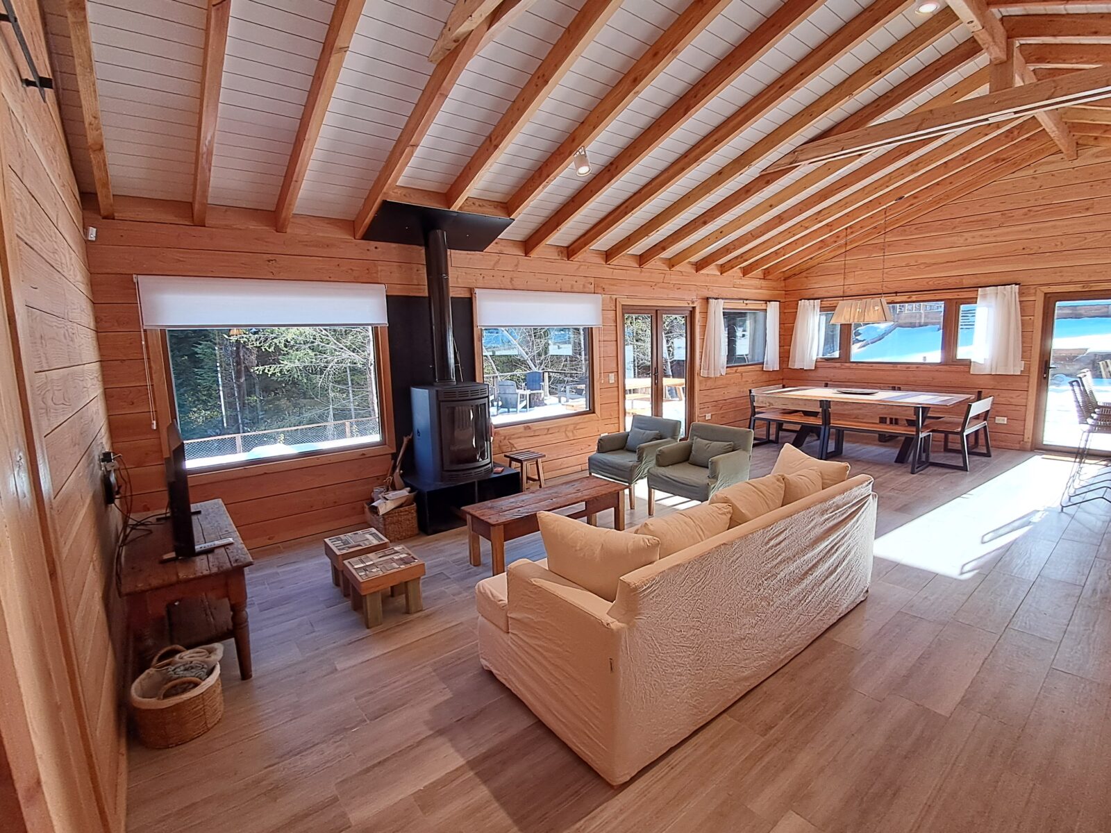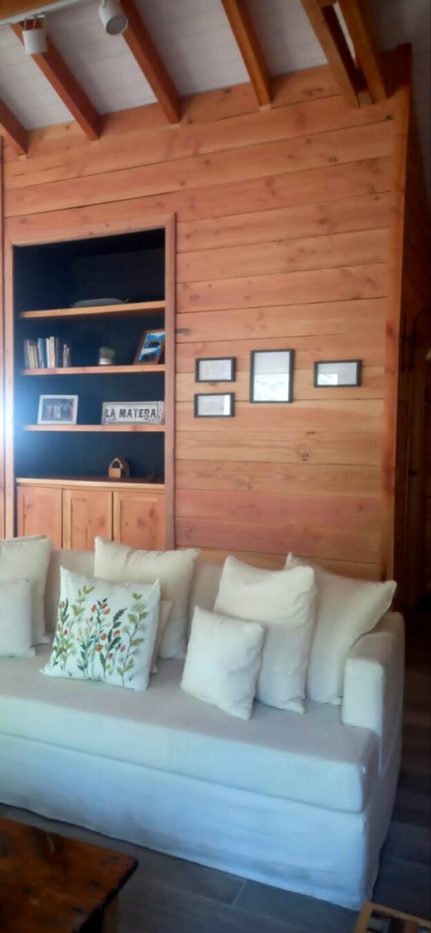 El Living tiene sillón de 2,10 más dos individuales y banquitos materos, mesa ratona, Smart TV de 43 pulgadas con sistema Android y estufa a leña Tromen modelo Berlín con guarda leña inferior .