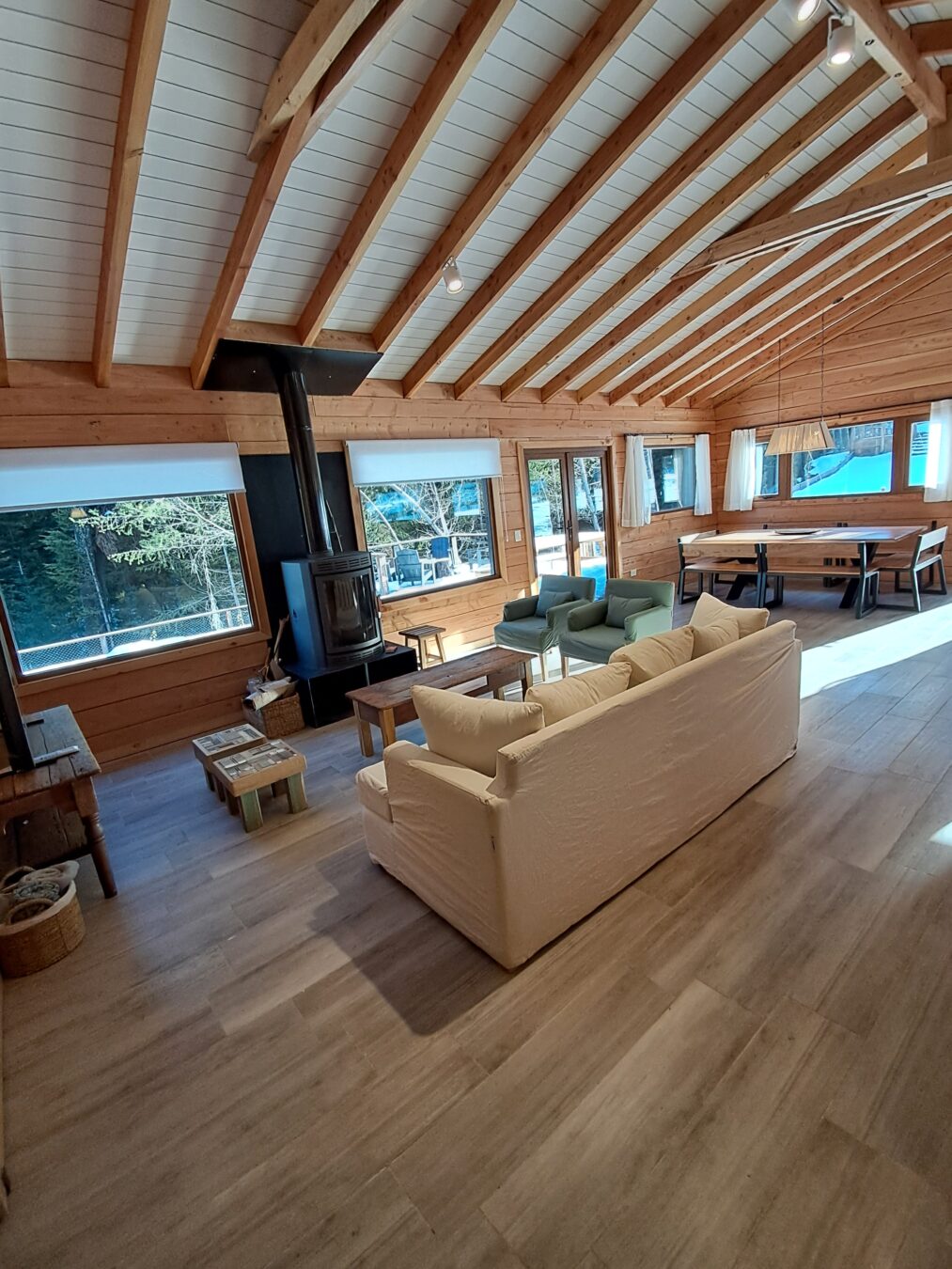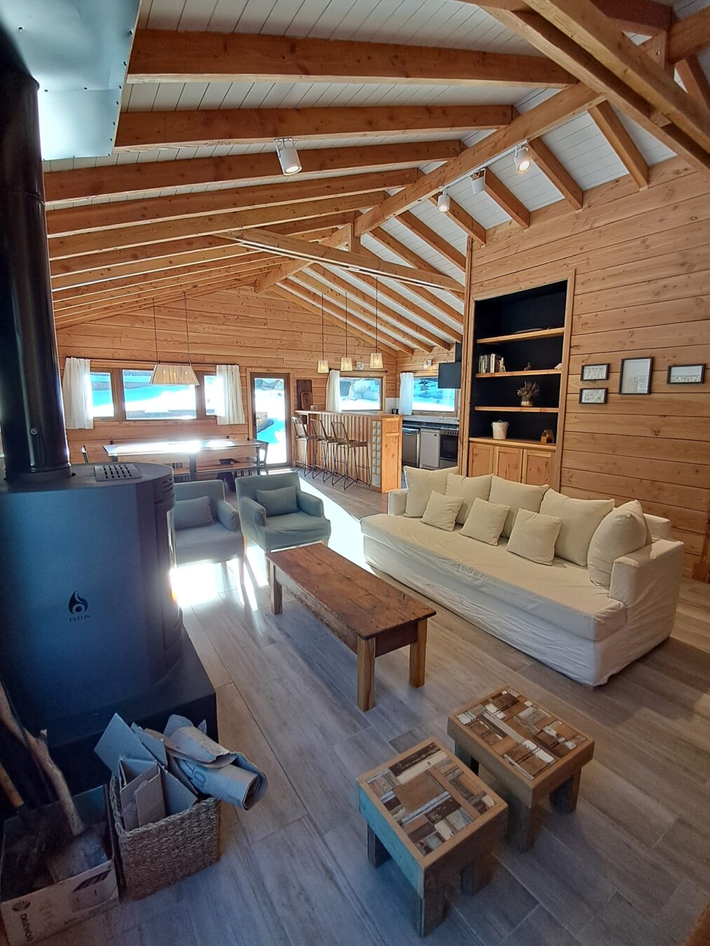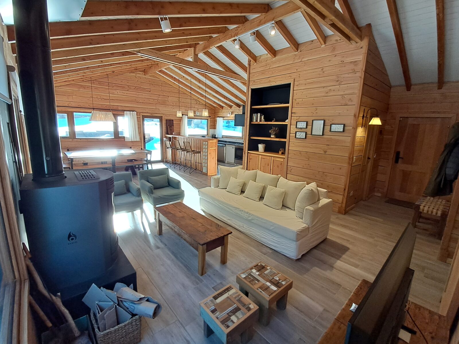 El Living tiene sillón de 2,10 más dos individuales y banquitos materos, mesa ratona, Smart TV de 43 pulgadas con sistema Android y estufa a leña Tromen modelo Berlín con guarda leña inferior .