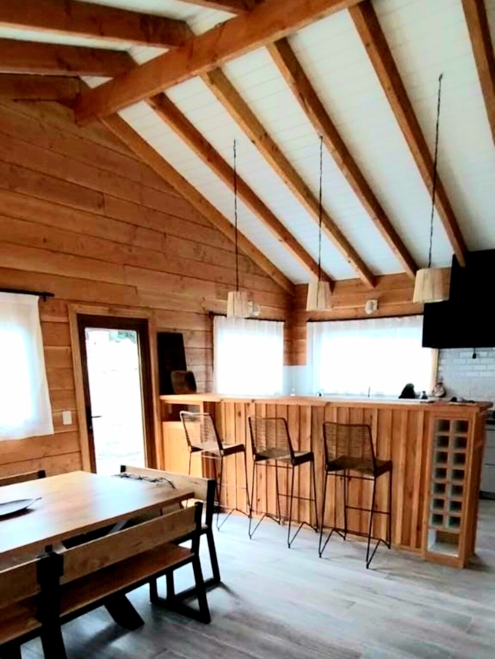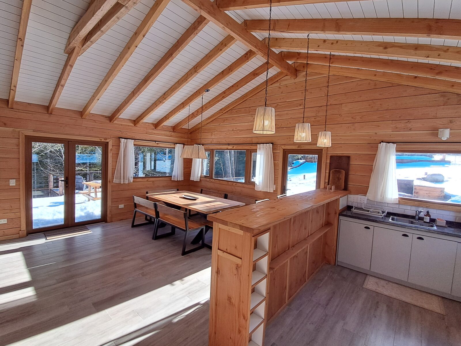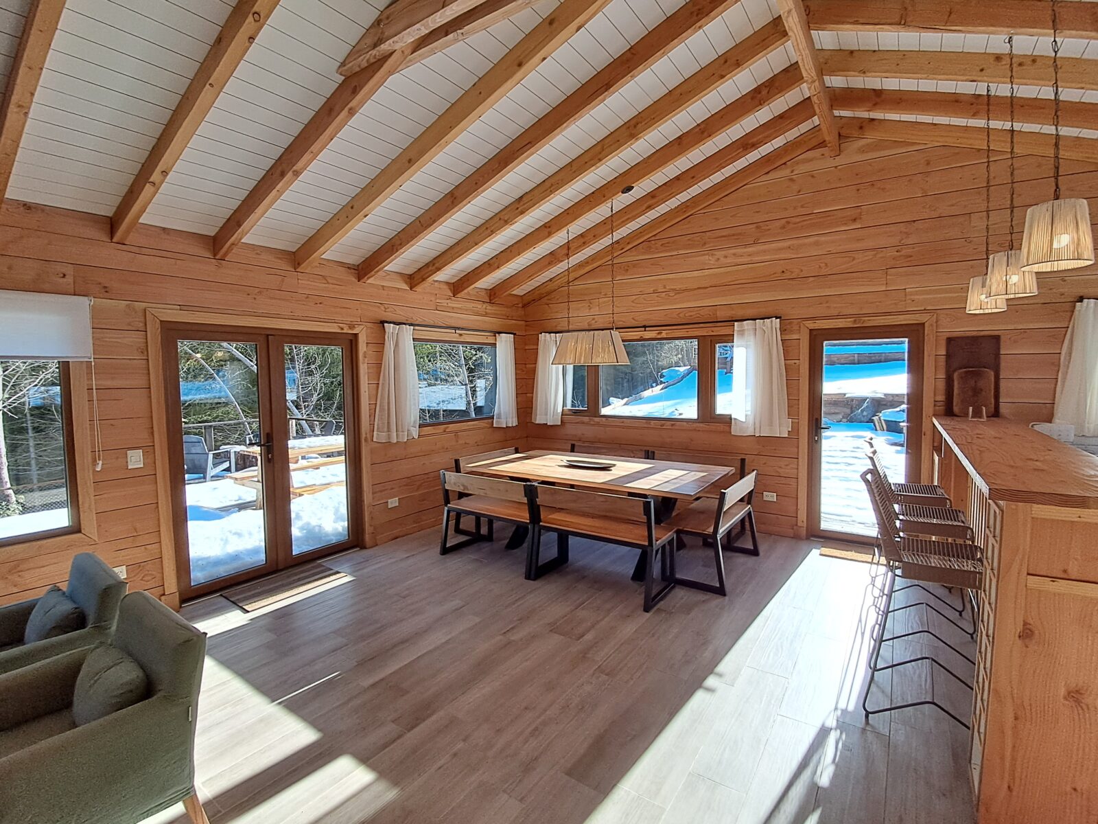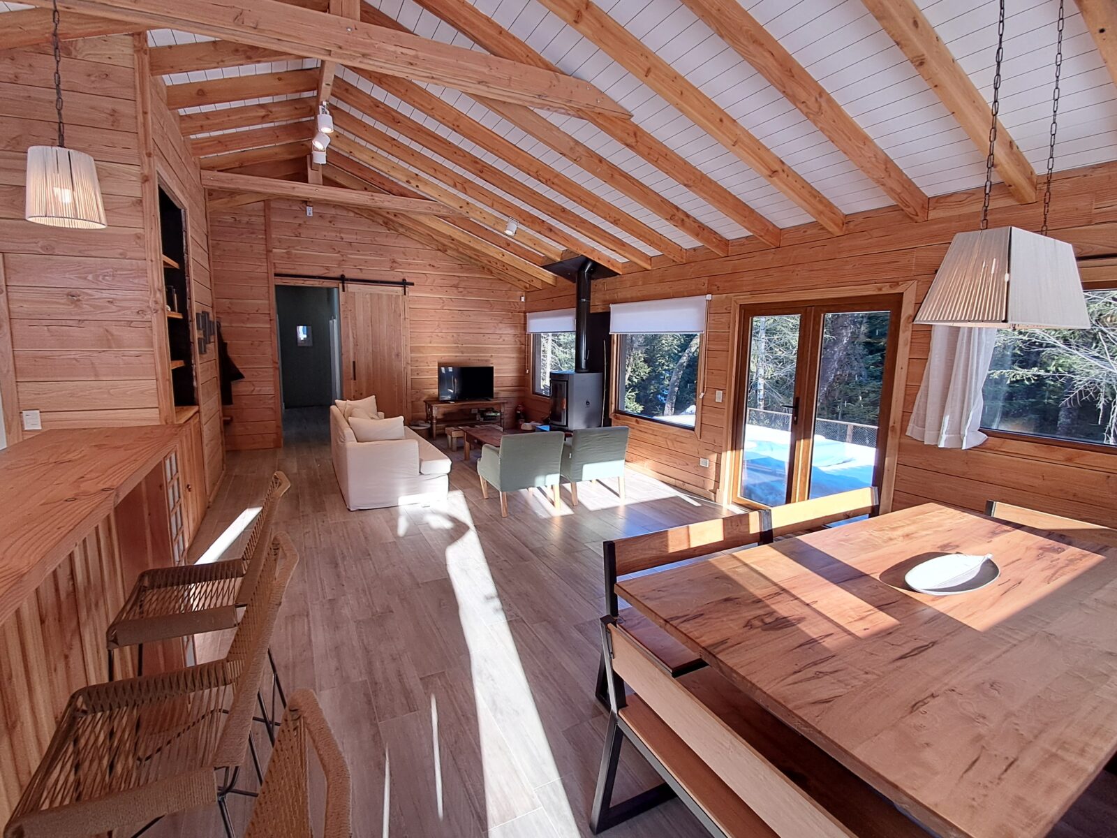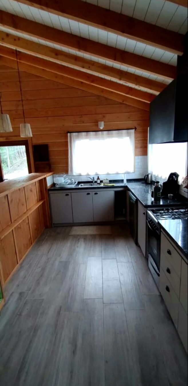 Living comedor y cocina integrados, estando esta última separada por una barra de 3,50 mts. Este espacio integrado tiene una superficie de 60 mts revestido en madera de pino Oregon desde el cual se puede acceder al deck exterior