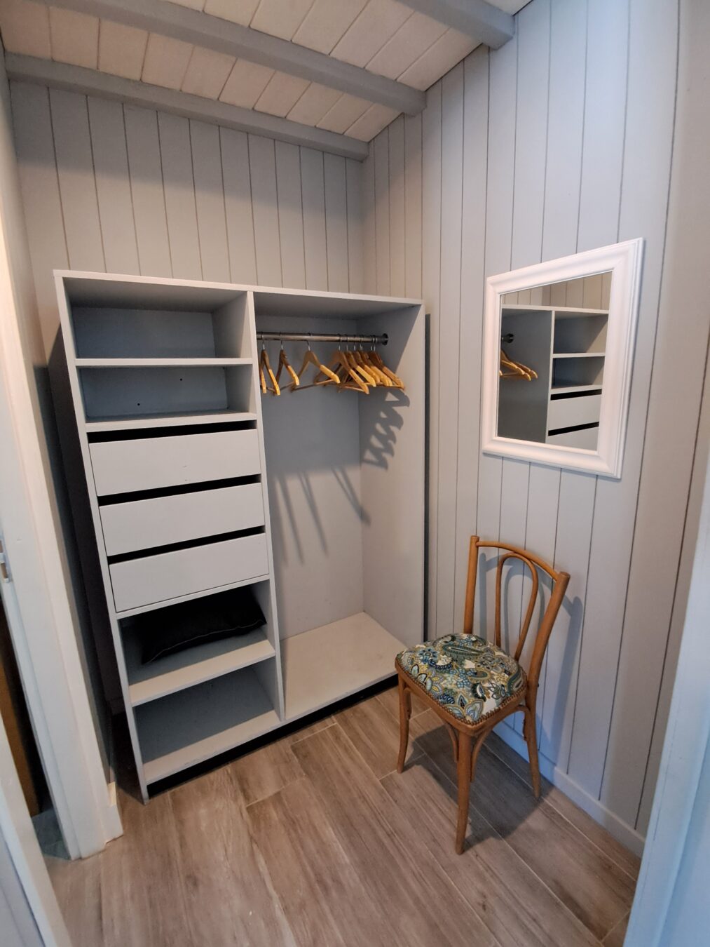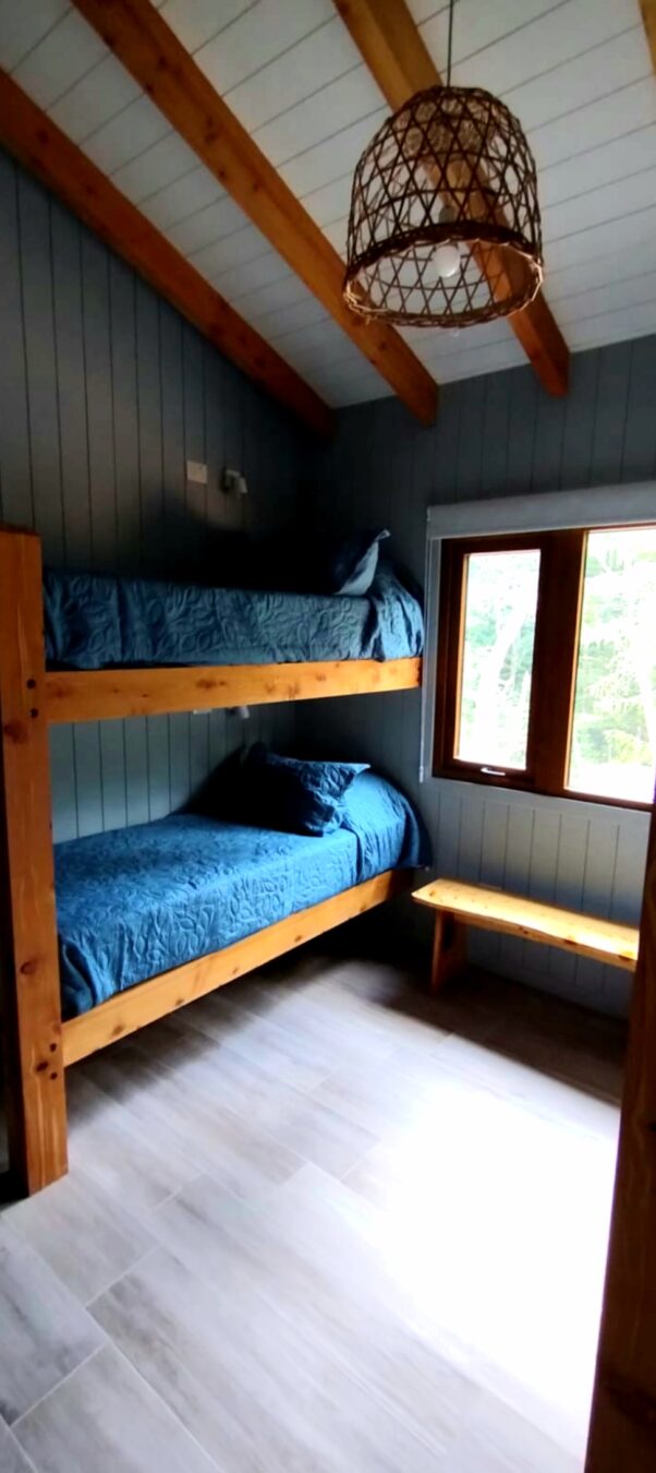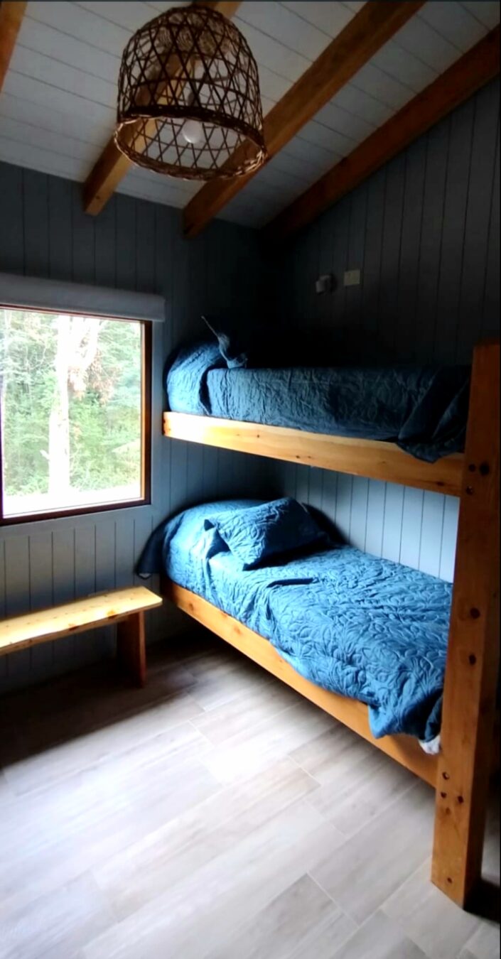 Dormitorio 3: para 4 personas. Consta de 2 pares de cuchetas con colchones de alta densidad, baranda en las camas superiores y escaleras, placard, veladores individuales y boxes para celular, libro, etc en cada cama y ventana al bosque