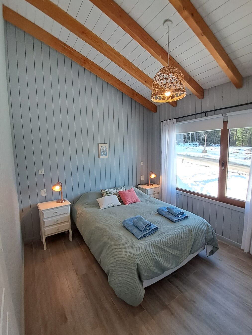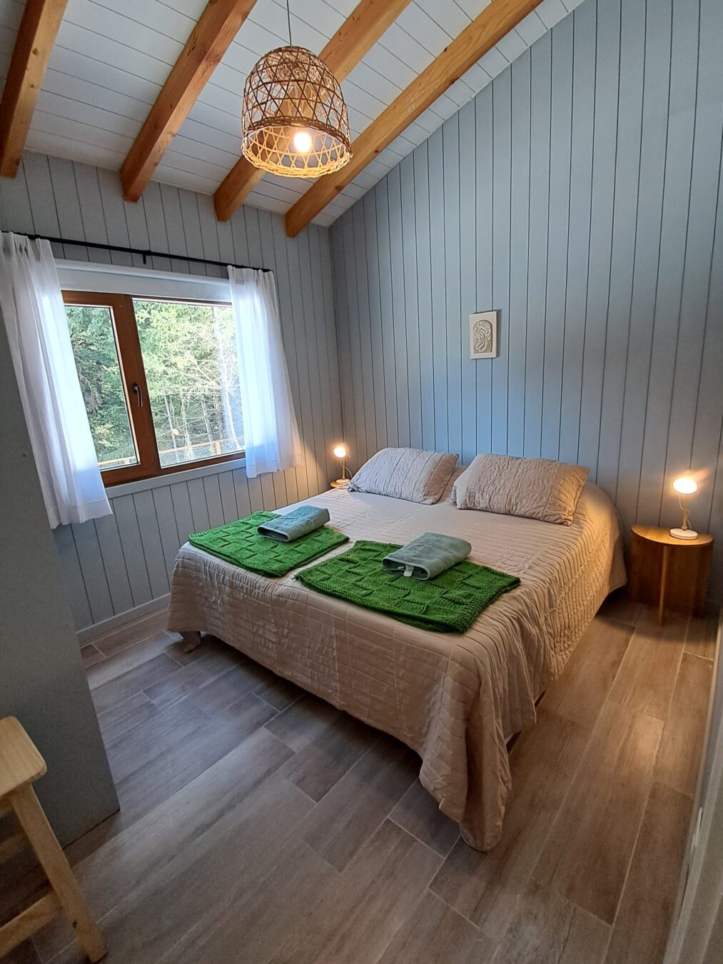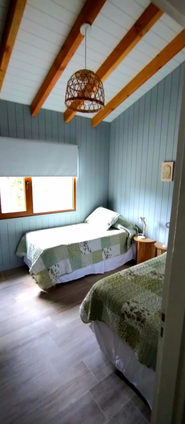 Dormitorio 2: para dos personas. Tiene dos sommiers con colchones de alta densidad (se puede armar con cama matrimonial) , placard, mesas de luz individuales con sus veladores y ventana con vista al bosque