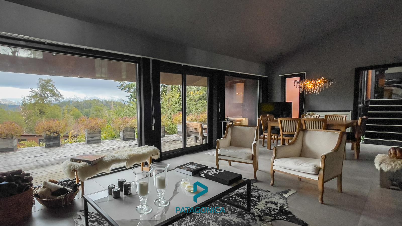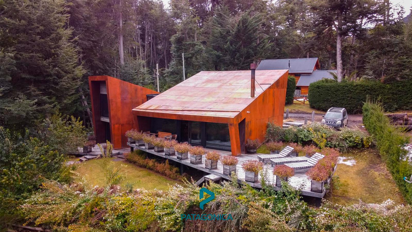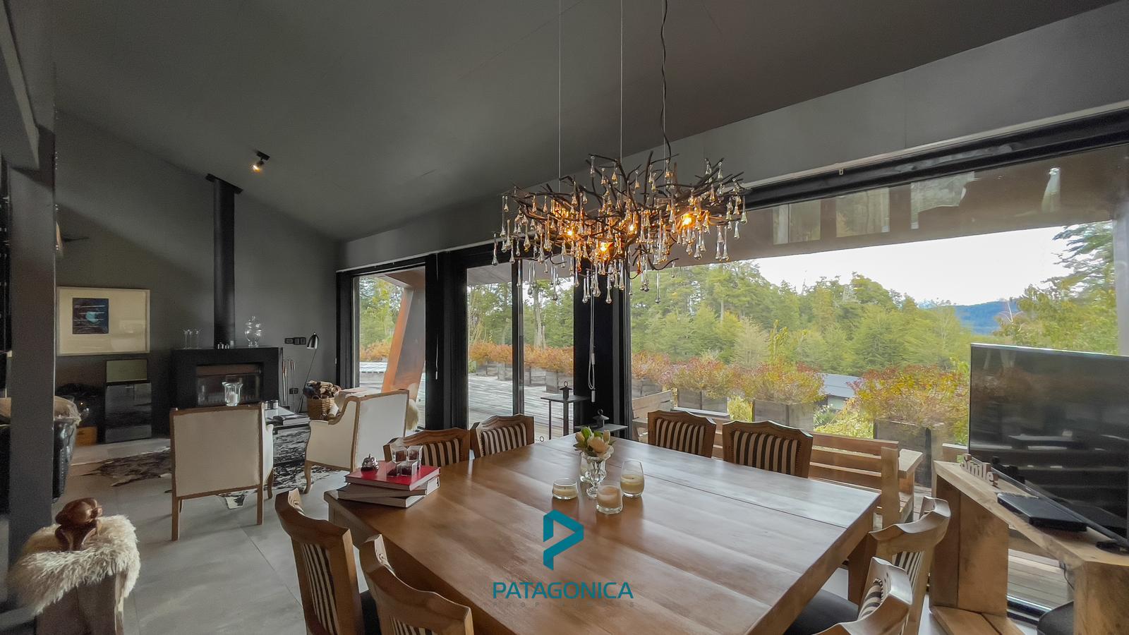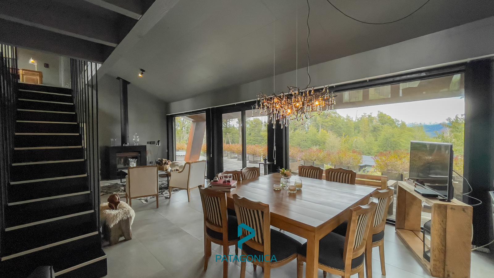 La casa tiene un marcado estilo moderno que combina espacios amplios y luminosos con detalles patagonicos. Esta dividida en dos grandes volumenes separados por un pasillo que divide areas comunes de areas privadas.