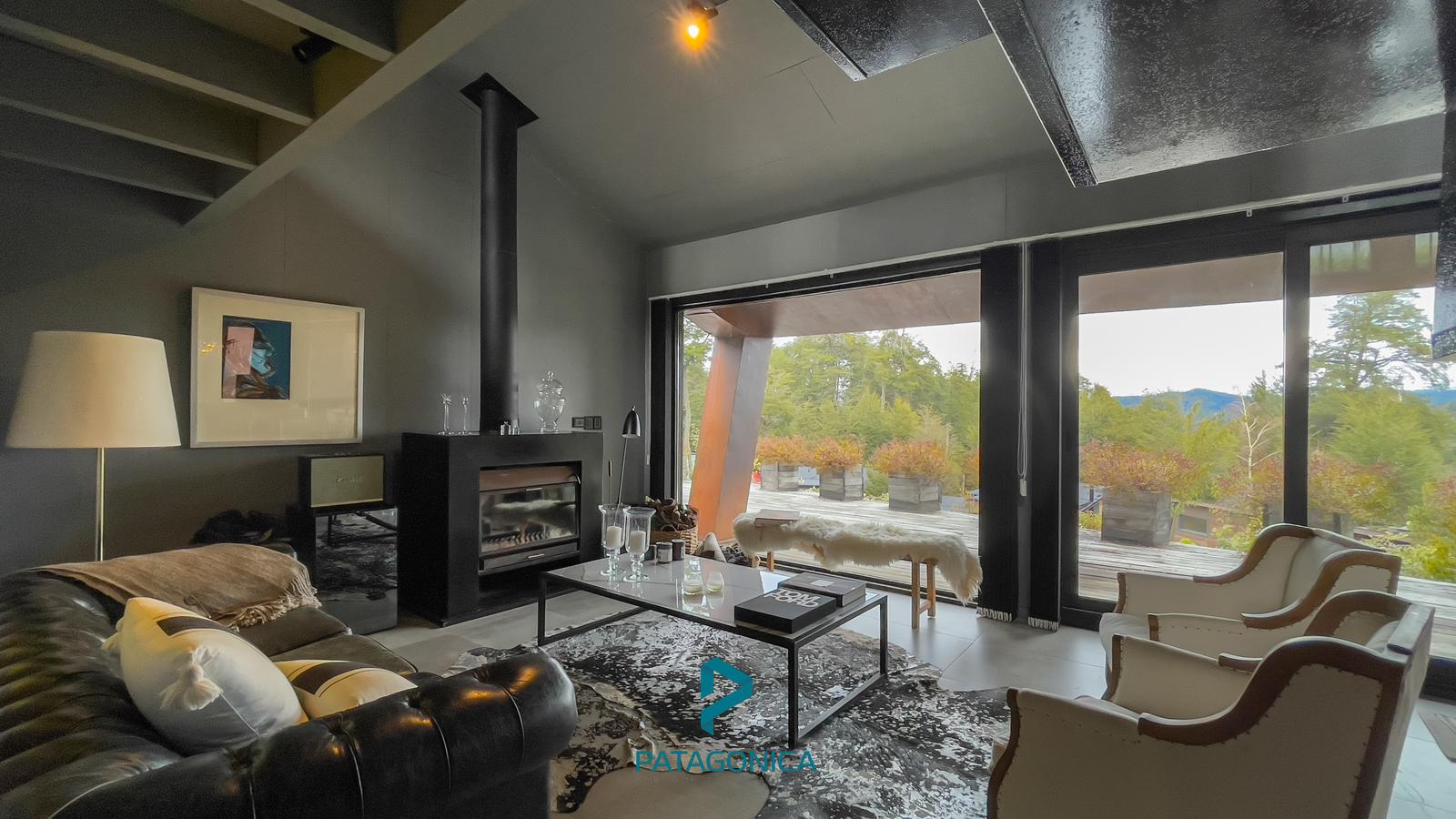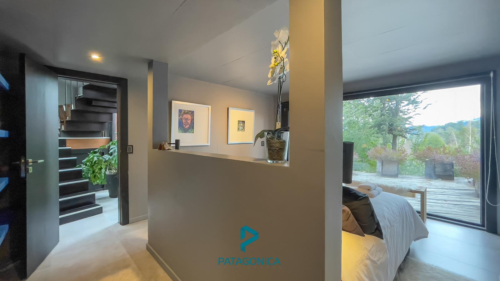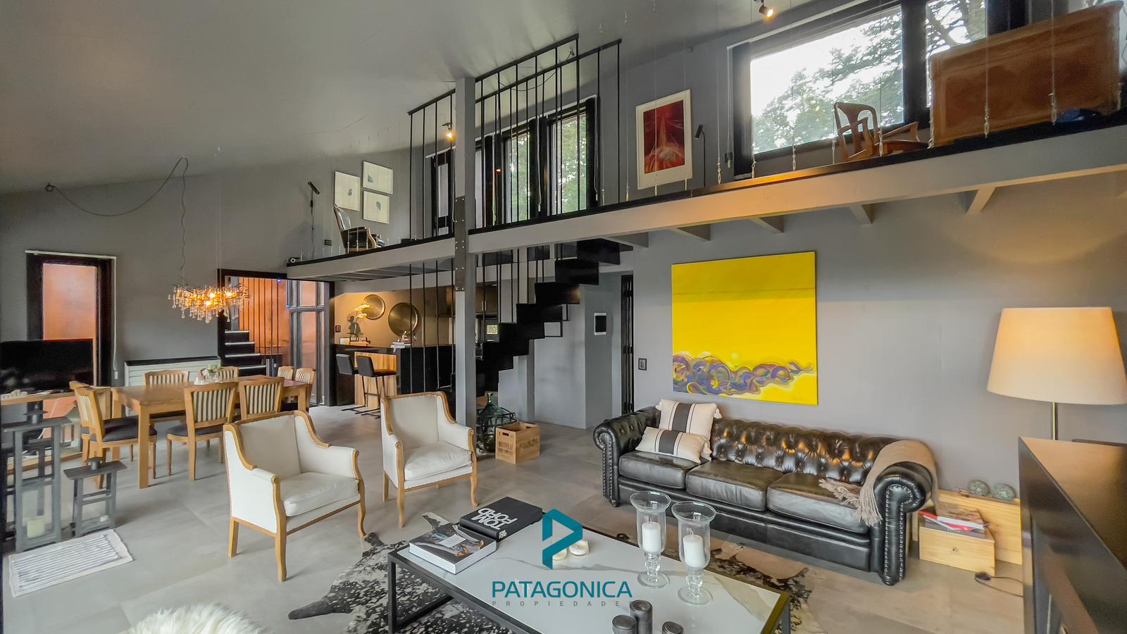 La casa tiene un marcado estilo moderno que combina espacios amplios y luminosos con detalles patagonicos. Esta dividida en dos grandes volumenes separados por un pasillo que divide areas comunes de areas privadas.