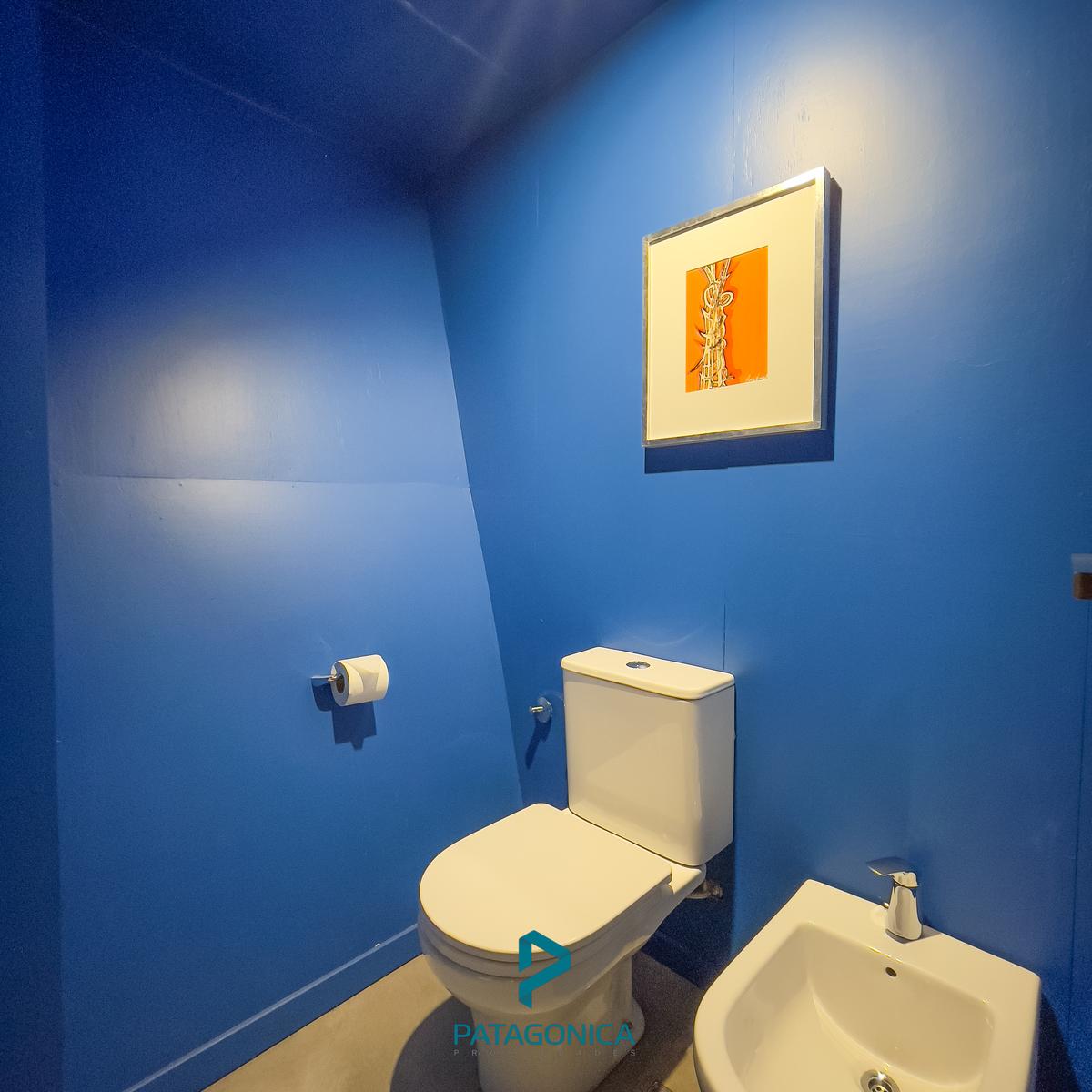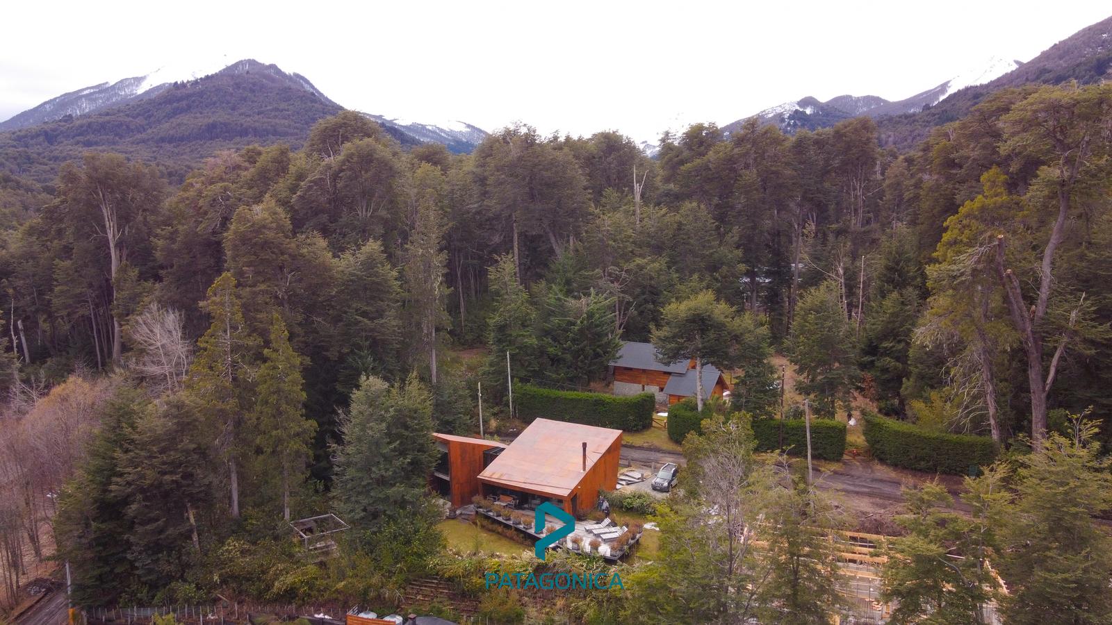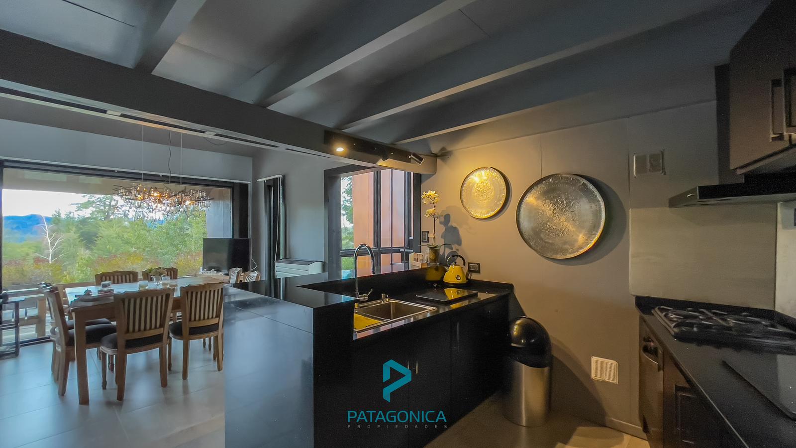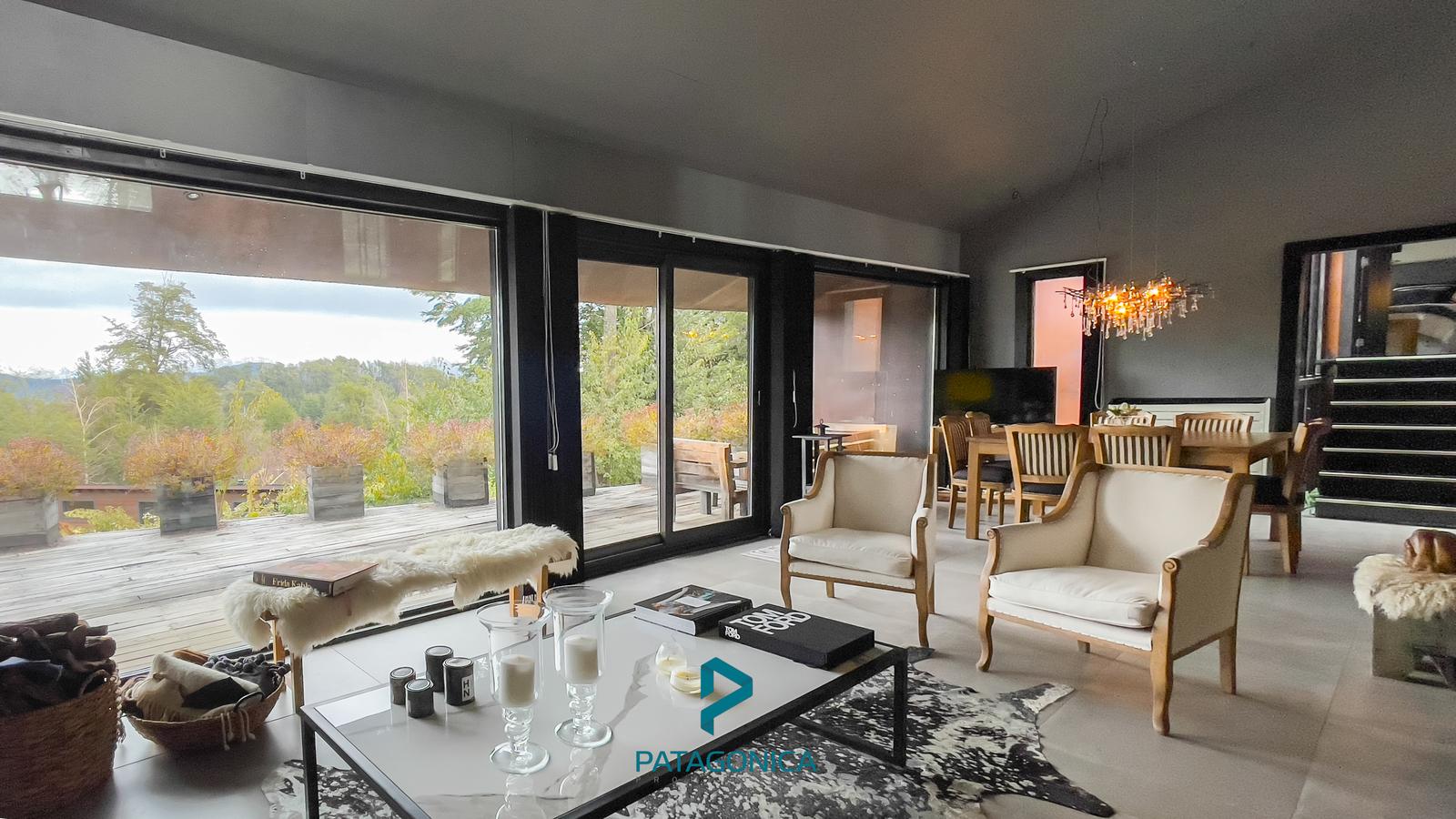 La casa tiene un marcado estilo moderno que combina espacios amplios y luminosos con detalles patagonicos. Esta dividida en dos grandes volumenes separados por un pasillo que divide areas comunes de areas privadas.